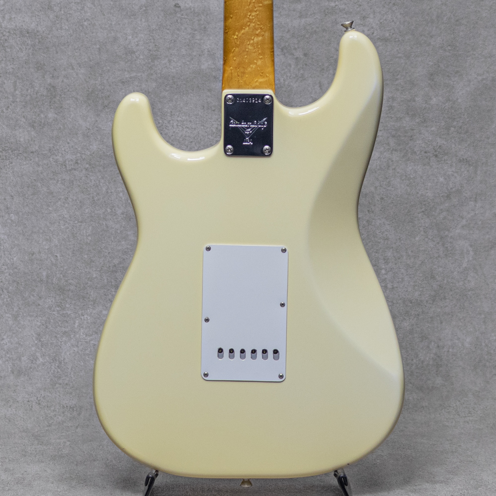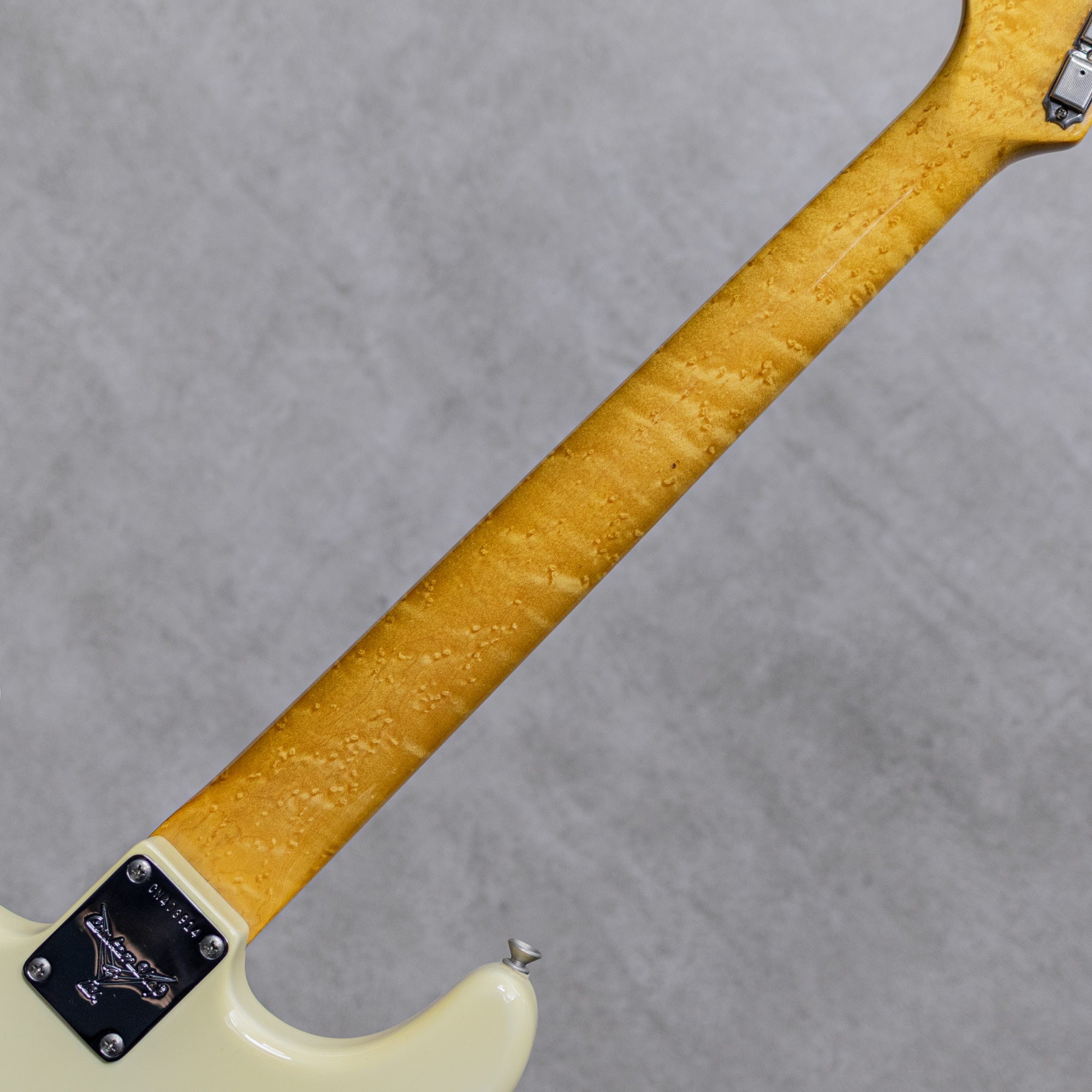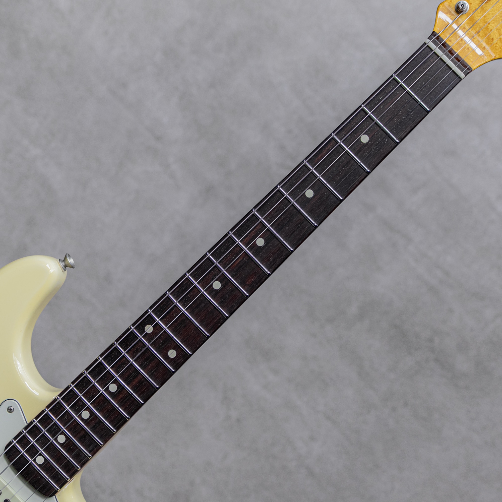 90年代カスタッムショップ製”1960 Stratocaster Vintage White”。カスタムショップ共同設立者として設立当時から在籍した”John Page(ジョン・ペイジ)”サイン認定書の1995年製USED品。美しいバーズアイメイプルの"H.Gastelum"ネックと、色焼けがクールなビンテージホワイトの1本アルダー2pcsボディ、スラブローズ指板のウッドスペックといった王道スペック。この当時FCSでは山野楽器オーダーのレトロスペクティブギアシリーズやマスターグレードモデルなど、数多くのビンテージリシューモデルが積極的かつ高品質で製作されており、マテリアルも極上材をふんだんに使用し製造されていました。本器でも、ネック材にびっしりと杢の入ったバーズアイメイプルが板目取りで使用されています。そして初期カスタムショップで散見される”H.Gastelum”のネックスタンプ。”Herbie Gastelum”は1961年から2017年までFenderにて56年勤め上げた職人で、”King of Feel”と言わしめたネック職人。MGで高い評価を誇ったカスタムショップを盛り上げ、また絶大な人気を誇る元マスタービルダー”John Cruz”の師匠でした。そんな彼の仕事でもあるネックグリップは60 Style Oval Cシェイプで、少し肉付きがあり手へのフィット感がとても心地良いネックシェイプです。ミントグリーンピックガード、カスタムショップ製60sピックアップx3、0.1uFフィルムコンデンサー搭載。トーン回路はフロント、ミドル・リアの配線にされています。また、ビンテージスペックを踏襲しながらも、胴内導電塗料などのフォロースペックも持ち合わせています。しっかりとした音像とハリのあるアタック、そしてしっかりと支えあげてくれる倍音。ストラトらしさを存分に味わいながら、使い勝手良く積極的に使える1本です。使用に伴う若干の小傷や使用感は伺えますが、経年を考えるととても良いコンディションで保たれた本器。ナット交換、指板9.5Rでのミディアムフレットでのリフレットがされており、現役バリバリで使える即戦力モデルです。フレット残りも90〜95%以上残っており、ネックコンディションも良好でトラスロッドの余裕もあり、低いアクションにセットアップしていますが、ハイフレットまで音詰まりなく演奏面も良好です。30年の経過を持つ使い頃な極上ヴィンテージリイシュー・ストラト。程度の良い実戦向きのストラトをお探しの方にオススメの1本です。フェンダーブラウントーレックスハードケース、認定書、オリジナルトレモロアーム、ストラップなど新品時の付属品もしっかりと残されています。
