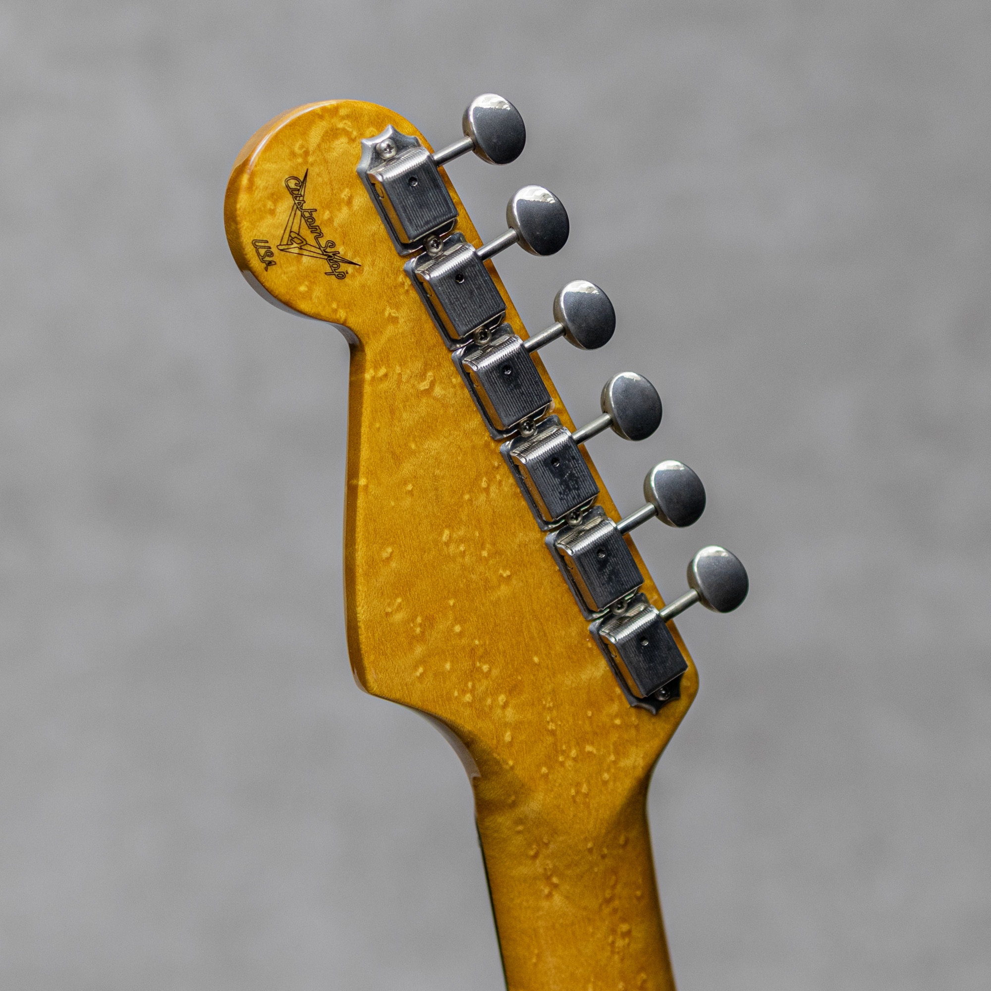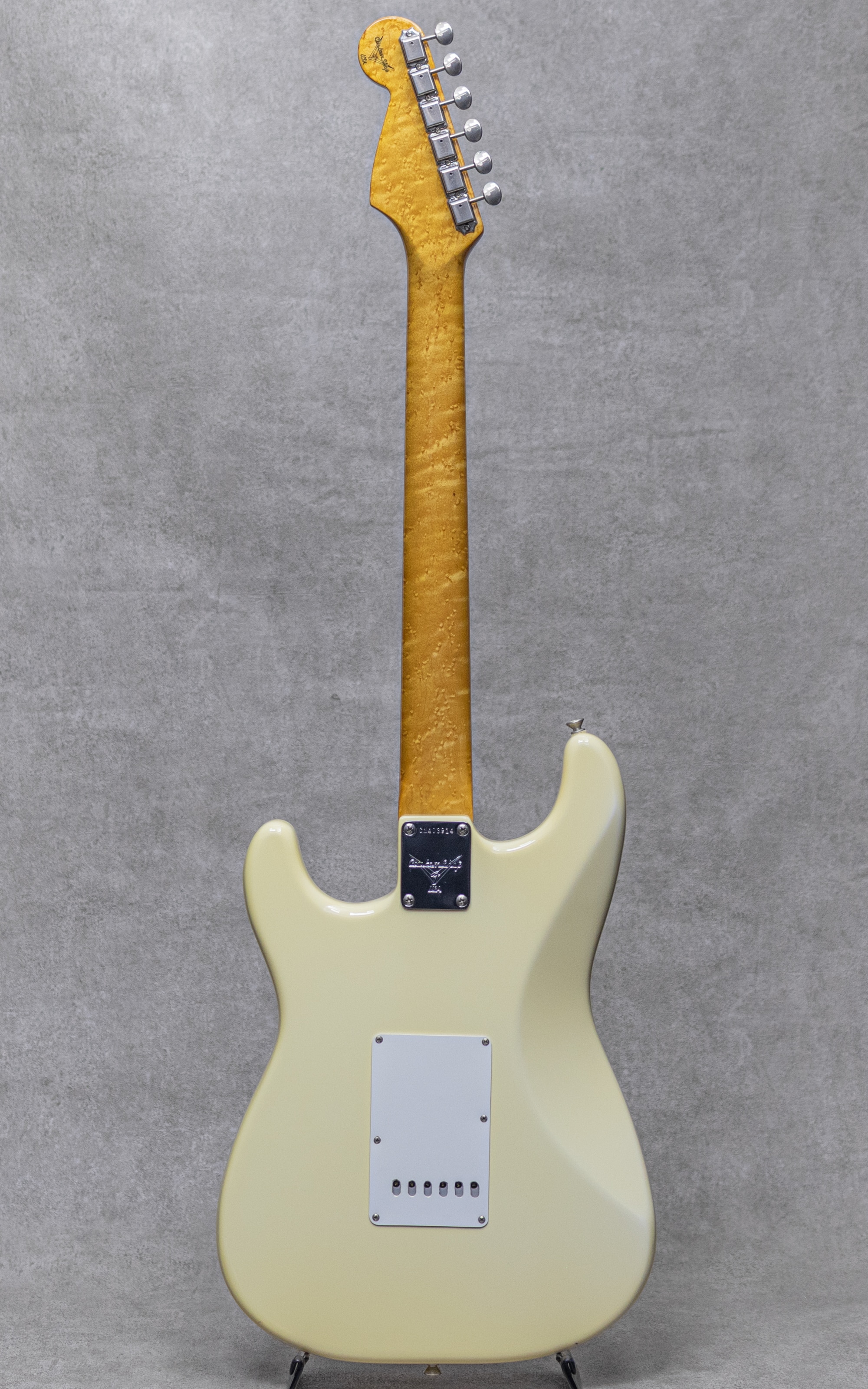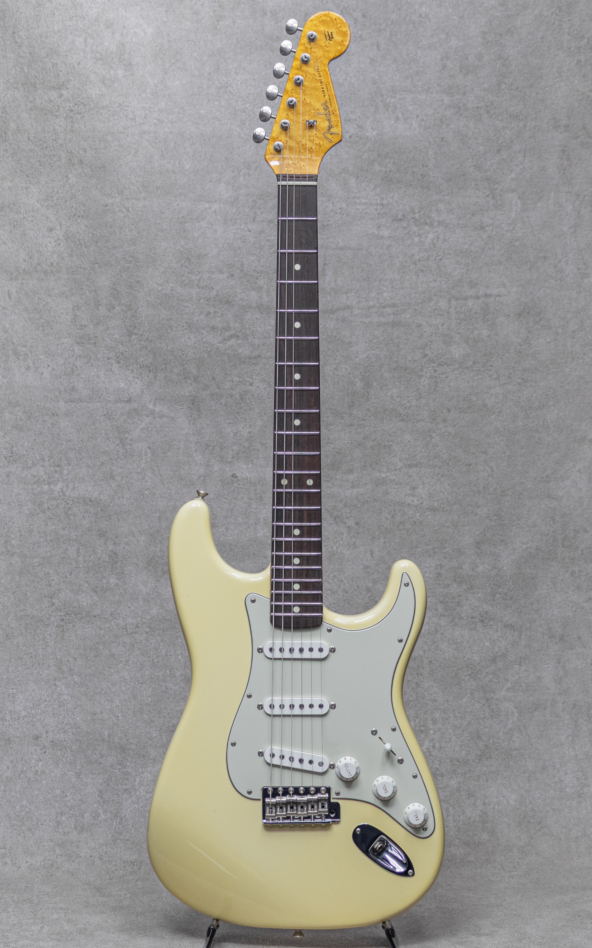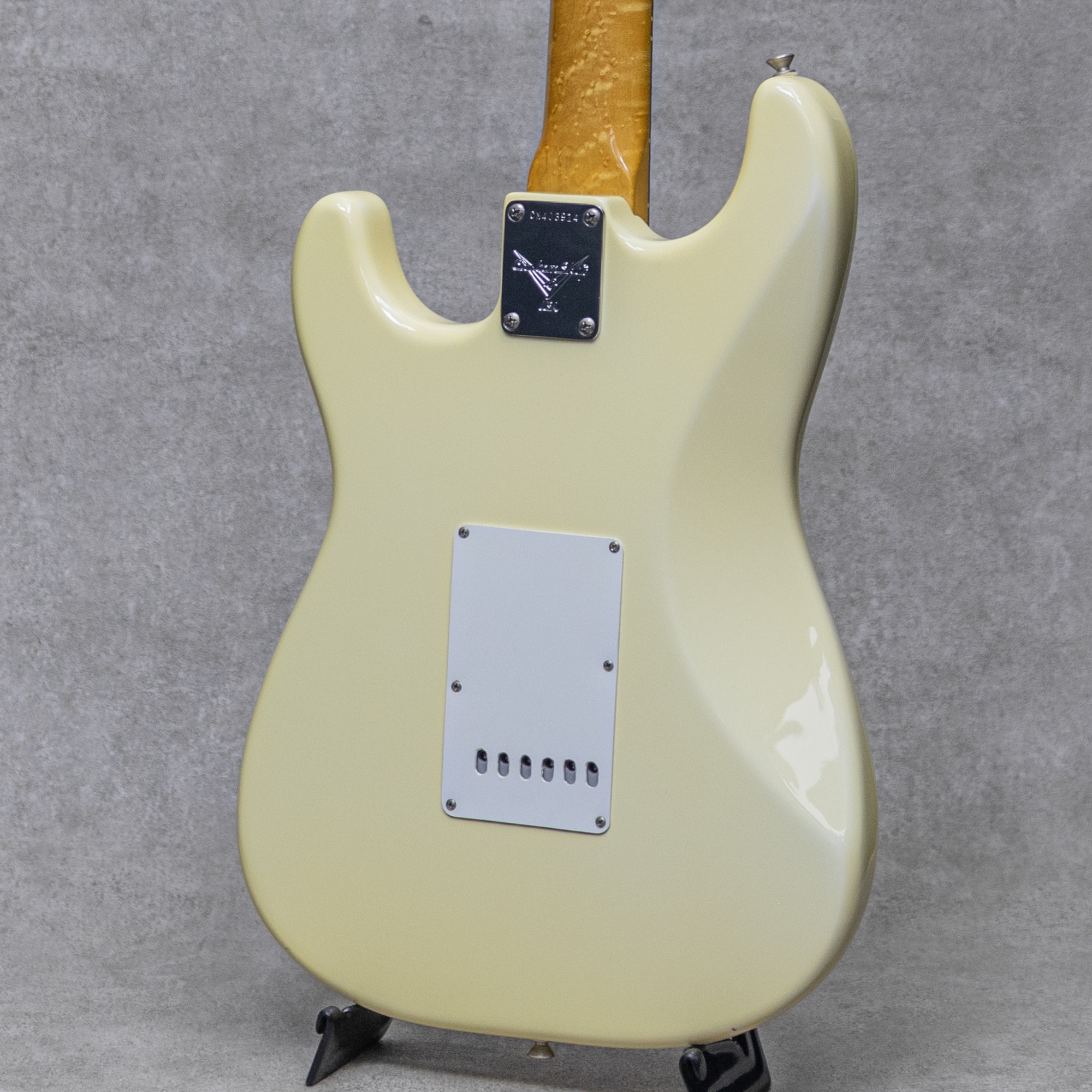 90年代カスタッムショップ製”1960 Stratocaster Vintage White”。カスタムショップ共同設立者として設立当時から在籍した”John Page(ジョン・ペイジ)”サイン認定書の1995年製USED品。美しいバーズアイメイプルの"H.Gastelum"ネックと、色焼けがクールなビンテージホワイトの1本アルダー2pcsボディ、スラブローズ指板のウッドスペックといった王道スペック。この当時FCSでは山野楽器オーダーのレトロスペクティブギアシリーズやマスターグレードモデルなど、数多くのビンテージリシューモデルが積極的かつ高品質で製作されており、マテリアルも極上材をふんだんに使用し製造されていました。本器でも、ネック材にびっしりと杢の入ったバーズアイメイプルが板目取りで使用されています。そして初期カスタムショップで散見される”H.Gastelum”のネックスタンプ。”Herbie Gastelum”は1961年から2017年までFenderにて56年勤め上げた職人で、”King of Feel”と言わしめたネック職人。MGで高い評価を誇ったカスタムショップを盛り上げ、また絶大な人気を誇る元マスタービルダー”John Cruz”の師匠でした。そんな彼の仕事でもあるネックグリップは60 Style Oval Cシェイプで、少し肉付きがあり手へのフィット感がとても心地良いネックシェイプです。ミントグリーンピックガード、カスタムショップ製60sピックアップx3、0.1uFフィルムコンデンサー搭載。トーン回路はフロント、ミドル・リアの配線にされています。また、ビンテージスペックを踏襲しながらも、胴内導電塗料などのフォロースペックも持ち合わせています。しっかりとした音像とハリのあるアタック、そしてしっかりと支えあげてくれる倍音。ストラトらしさを存分に味わいながら、使い勝手良く積極的に使える1本です。使用に伴う若干の小傷や使用感は伺えますが、経年を考えるととても良いコンディションで保たれた本器。ナット交換、指板9.5Rでのミディアムフレットでのリフレットがされており、現役バリバリで使える即戦力モデルです。フレット残りも90〜95%以上残っており、ネックコンディションも良好でトラスロッドの余裕もあり、低いアクションにセットアップしていますが、ハイフレットまで音詰まりなく演奏面も良好です。30年の経過を持つ使い頃な極上ヴィンテージリイシュー・ストラト。程度の良い実戦向きのストラトをお探しの方にオススメの1本です。フェンダーブラウントーレックスハードケース、認定書、オリジナルトレモロアーム、ストラップなど新品時の付属品もしっかりと残されています。