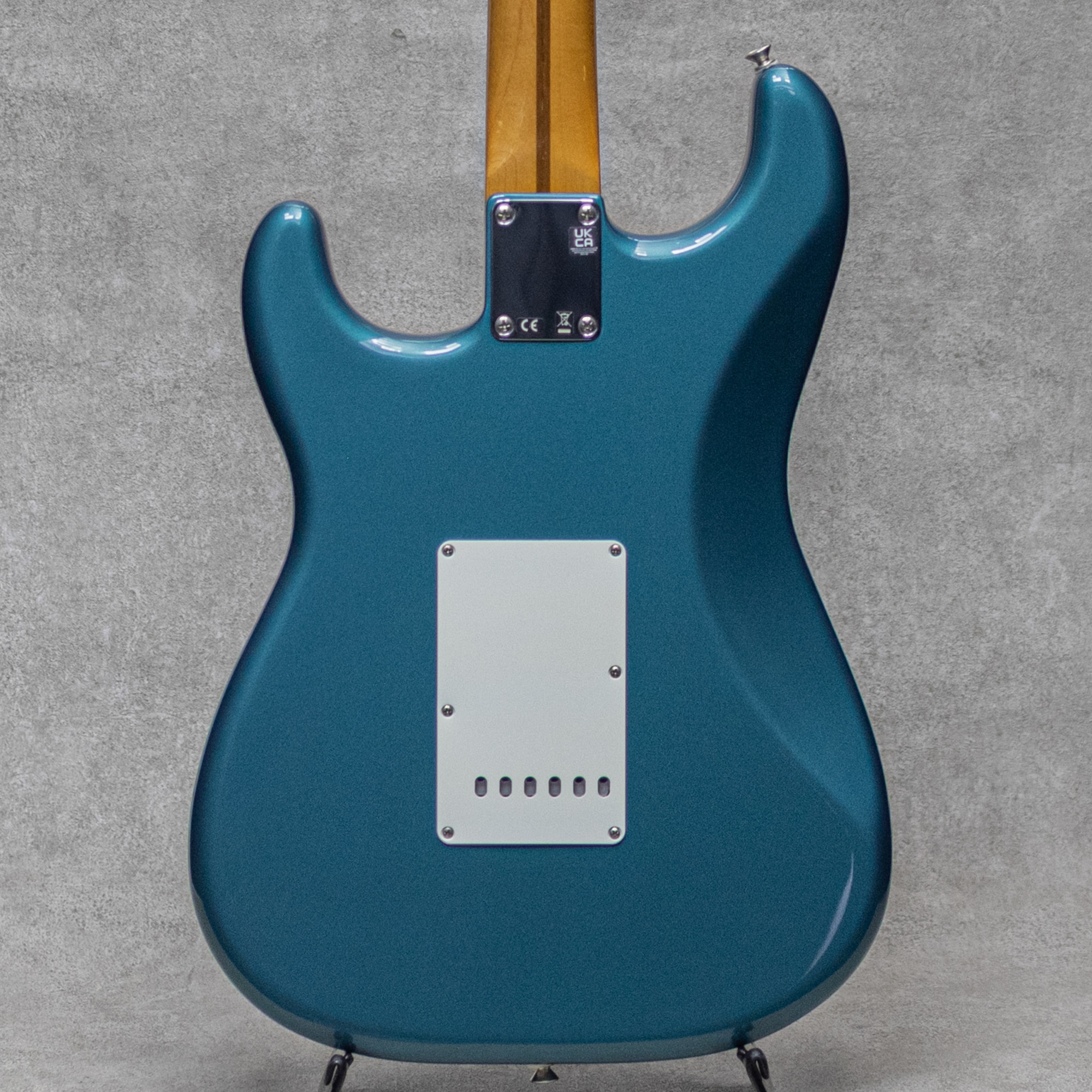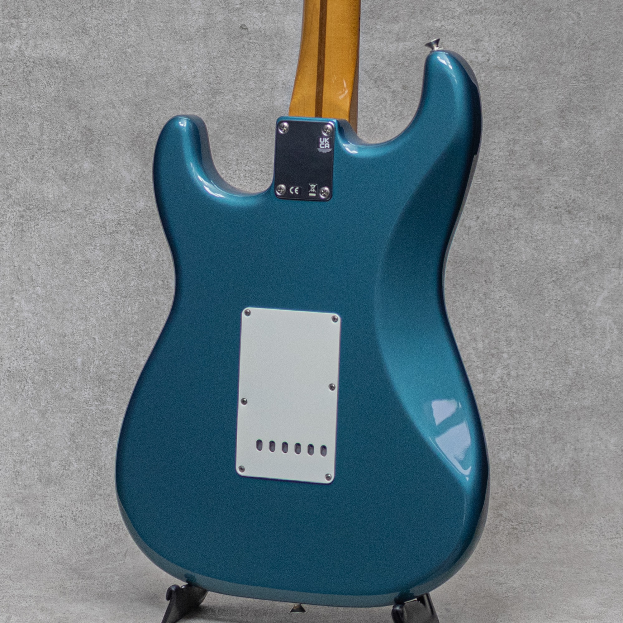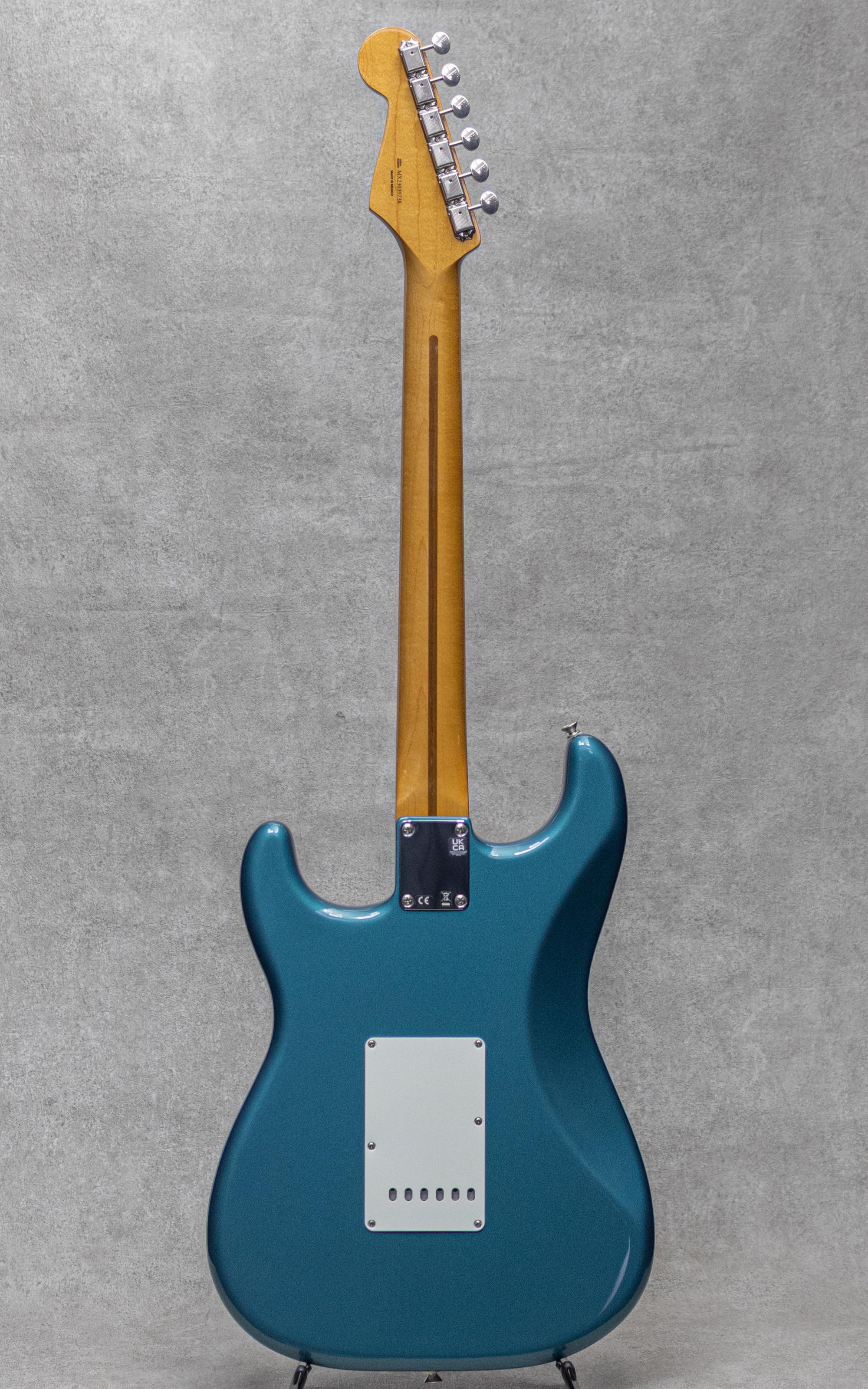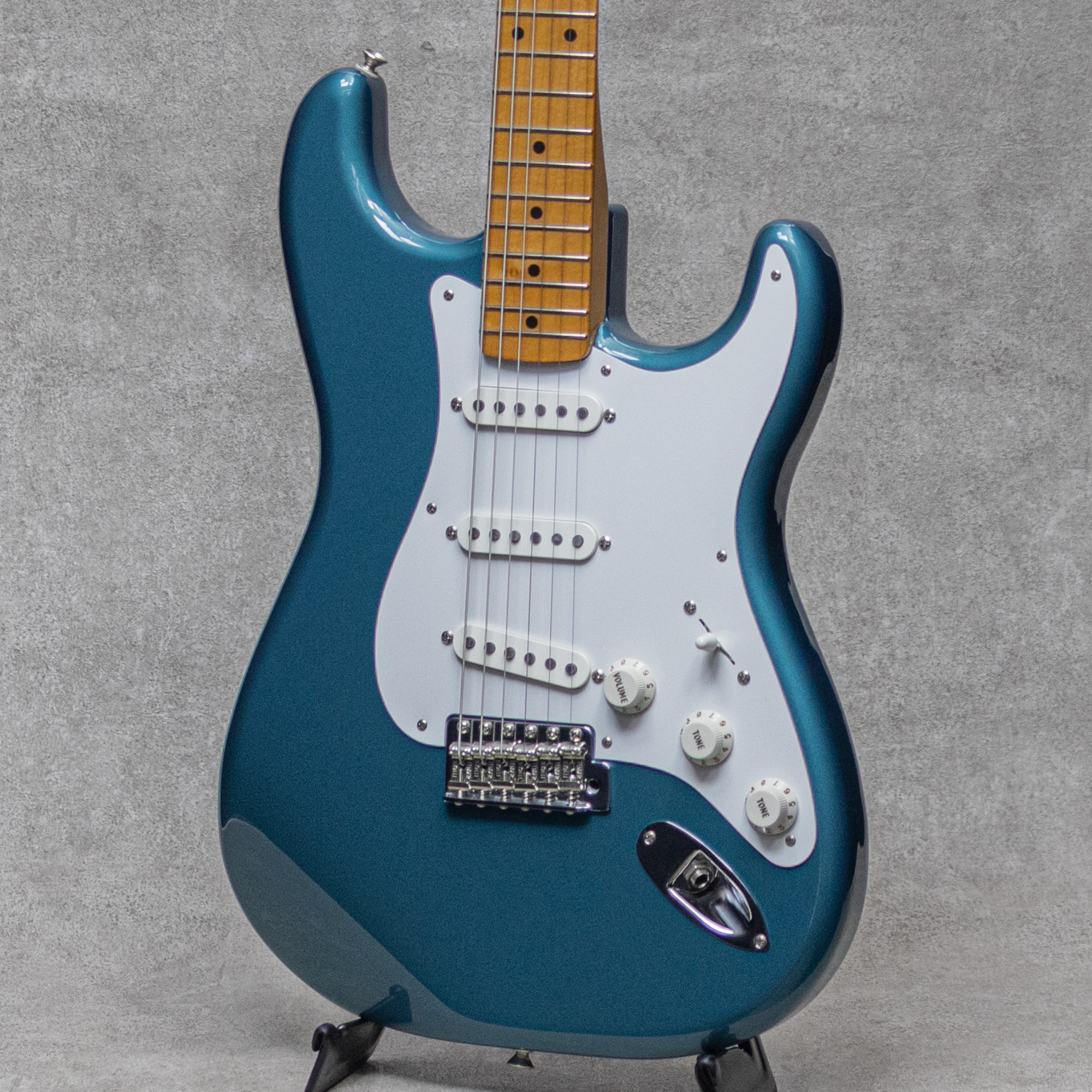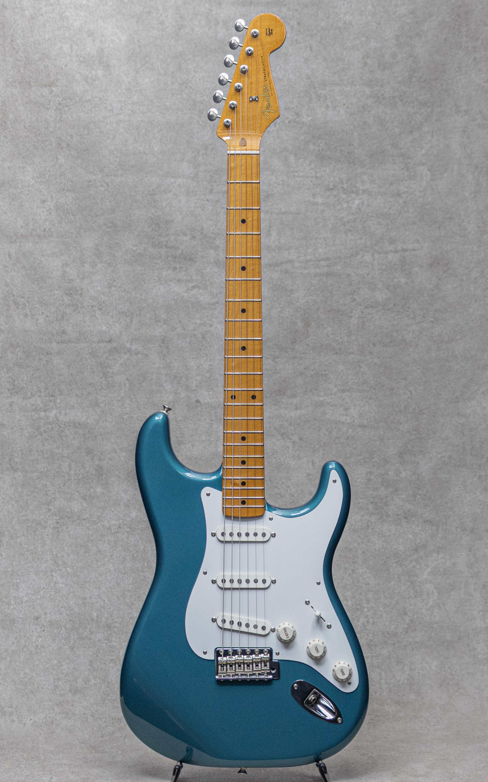 "Vintera II"シリーズは、2019年に登場した"Vintera"シリーズをブラッシュアップし2023年より展開を開始。比較的手にしやすいラインながら伝統的なFenderスタイルを存分に楽しめるメキシコ エンセナダ工場製造ラインナップの上位シリーズ。本器は"Vintera II 50's Stratocaster"。ポップさとトラッドを兼ね備えた"Ocean Turquoise Metallic"カラー。Fenderらしいアイコニックな明るさと透明感、心地よいパンチ感が魅力の50年代スタイル。7.25インチの指板Rにヴィンテージトールのフレットの組み合わせは、グッと握り込みやすいネックプロファイルで、特有に歯切れの良い弾き心地とエモーショナルなチョーキングやヴィブラートの表現が楽しいトラディショナルな仕様。コントロールは一般的な5way、マスターボリューム、2トーンですが、トーンは(ネック+ミドル)と(ブリッジ)の割り振りで現代的に使いやすい仕様を採用。こちら顕著な使用感を感じさせない演奏性、ルックスともにとても良好なコンディション。トラスロッドの調整を含め良好なネックコンディションでフレットの目立ったヘリもなく、即戦力でお楽しみいただける美品。トレモロスプリングのみRaw Vintageの5本張りにアップグレードされており、コードの肉厚感、各音に倍音を伴った暖かみあるトーンが付与されております。50'sスタイルのメイプルネックと1プライのピックガードに、クラシカルなメタリックカラーも抜群にカッコよく映える間違いない1本。ぜひお見逃しなく。オリジナルギグケースが付属。