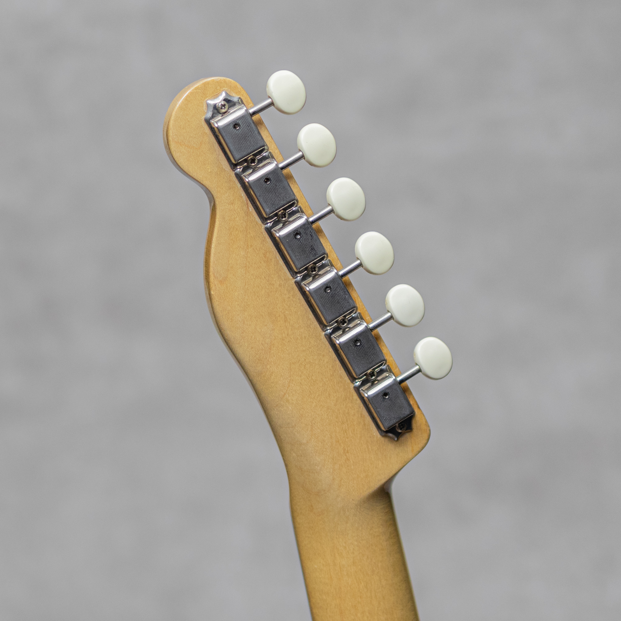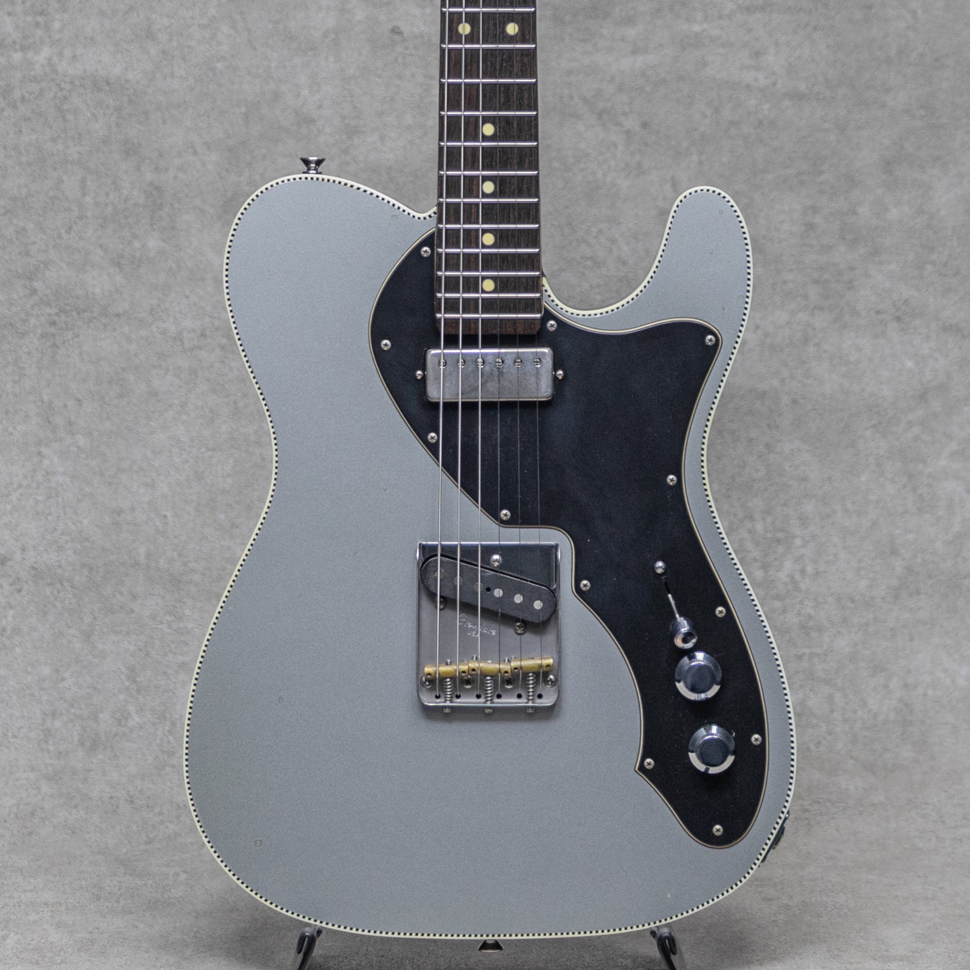 東京 恵比寿に拠点をおきオリジナルブランドを展開する"Psychederhythm(サイケデリズム)"。個別オーダーの他、少数ロットでの生産が続けられており、少ない生産本数ながらプロユースな演奏性の魅力により着実な人気を獲得、個性的かつ豊富なカラーリングバリエーションも人気の所以です。本器は2012年製"Solid T-Line Custom"、シルバーカラーでオーダーされた1本。メイプルネック、7.25Rローズウッド指板、2pcsマホガニーボディ、チェッカーバインディング、オールラッカーフィニッシュ、Lundgren製"Mini Humbucker"&"Tele 7.5KΩ"ピックアップを搭載。芯のはっきりしたクリアなサウンドはモダンに扱いやすいキャラクターながら、一般的なソリッドエレクトリックモデルに求められる普遍性から大きく逸脱しない上手いチューニング。フロントのミニハムバッカーでは、歯切れ良くもバランスの整ったサウンドをアウトプット。テレキャスターでありがちなフロント/リアでの出力差も気にならずシームレスに切り替えができる点も嬉しいポイント。定評のある演奏性とも相まって、いつでも即戦力としてお使いいただけるポテンシャルで楽しませてくれます。こちらボディバック側エッジを中心に細々とした打痕や塗装のチップ、トップサイドにも当て傷などあるものの演奏性に影響のあるダメージはありません。ロッドの調整を含め良好なネックコンディションで弾きやすいセッティングができております。珍しいカスタムピックガードにチェッカーバインディングのクールな1本。ぜひご検討ください。ハードケースが付属