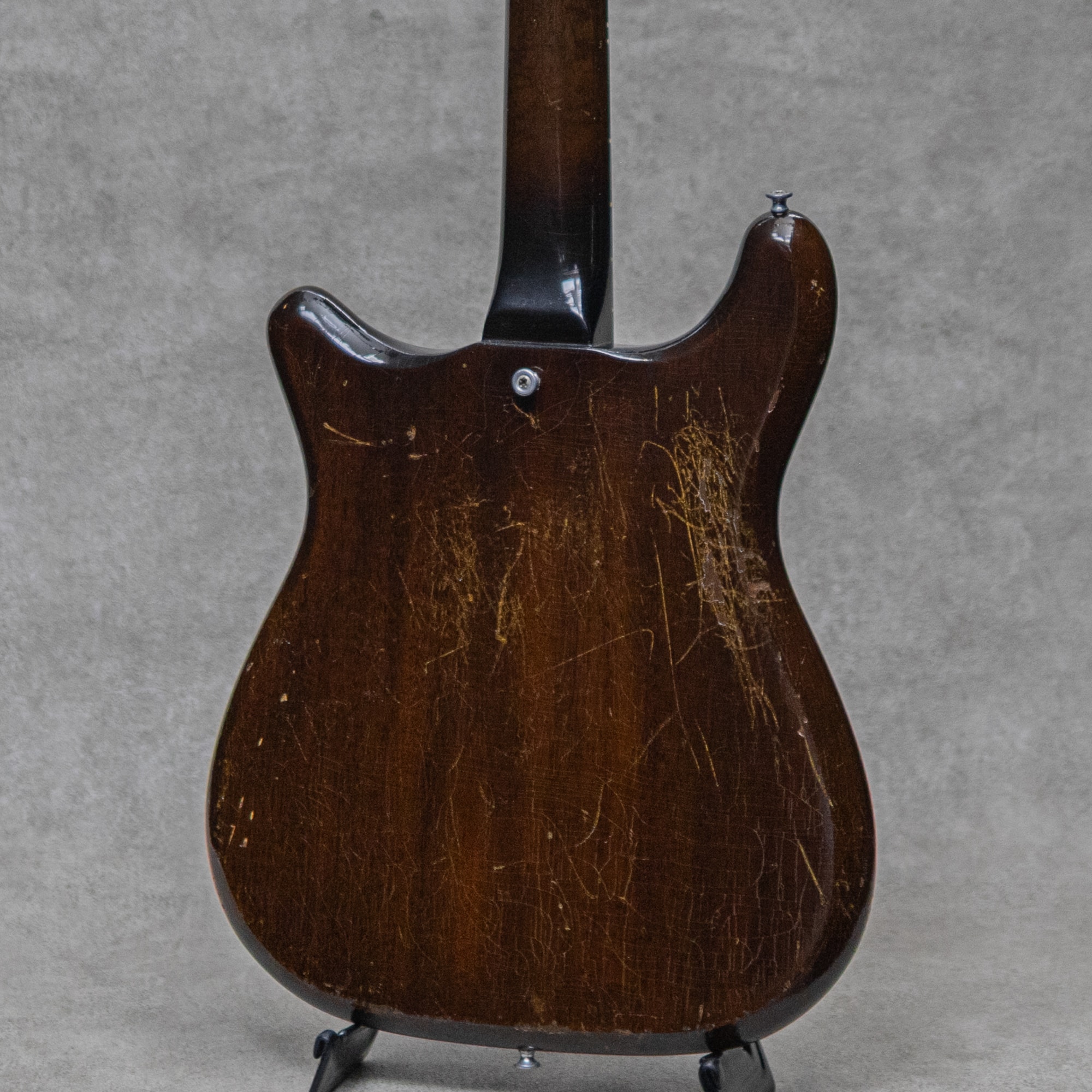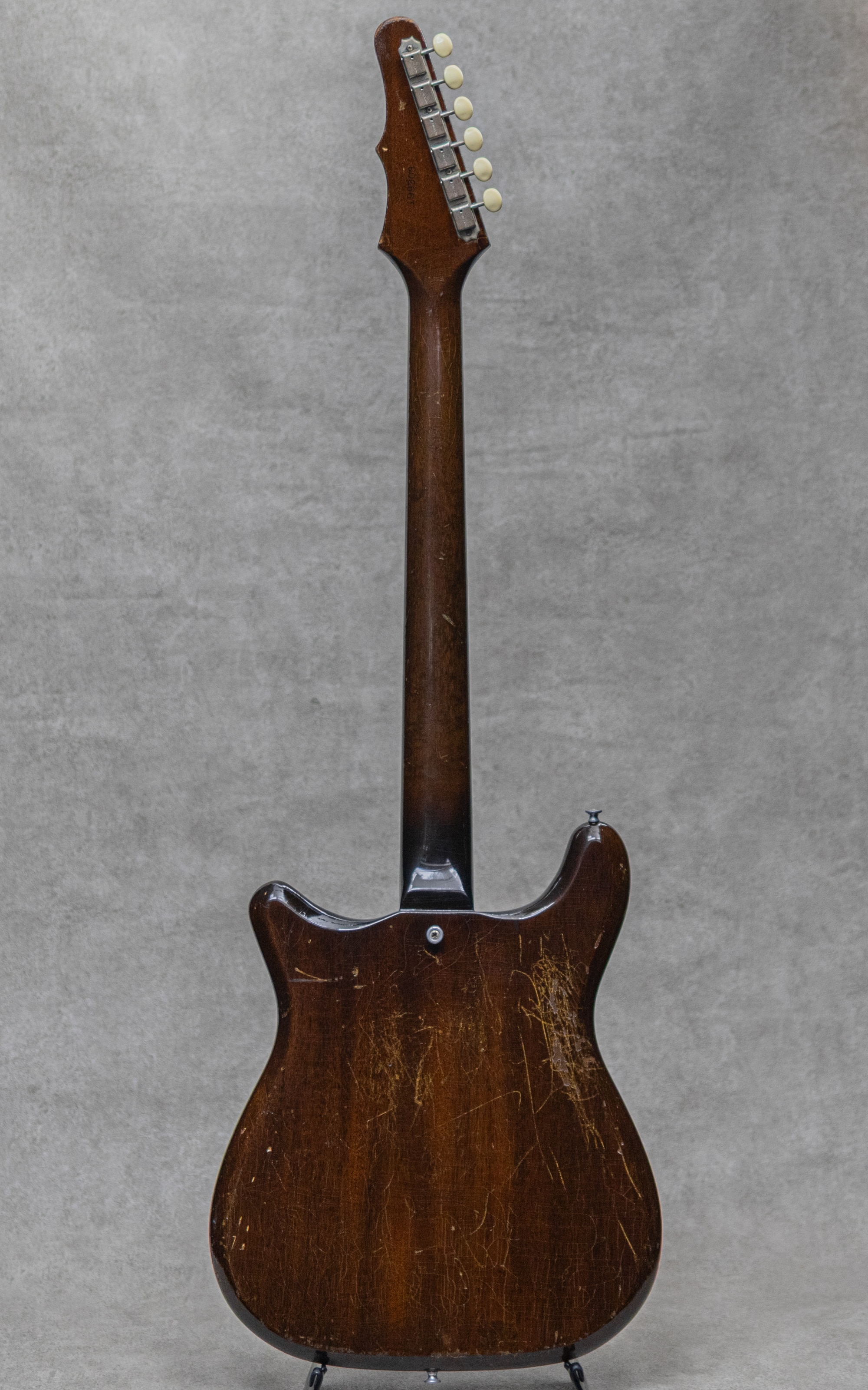 1960年登場のエピフォン"Olympic"はギブソンより展開された"Melodymaker"の従妹ともいえるモデルで、当時の普及価格ソリッドモデルとして同じくギブソン・カラマズー工場にて製造がされました。実は"Melodymaker"よりも細かな仕様変更が多い"Olympic"。登場初期は"Melodymaker"と同じシングルカットですが、1962年頃にダブルカットスタイルに変更、しかしそのすぐ後には兄弟機の"Coronet"、"Wilshire"、"Crestwood"とともに、エピフォンオリジナルのダブルカットスタイルに変更がされ、"Melodymaker"の単なる"エピフォン版"ではなくなっていきます。本器は1964年製"SB722MV Olympic"、Sunbustカラー。Olympic最終形態ともいえる非対称デザインボディ。既に他のソリッドモデルで採用が始まっていた通称"バットウィング"ヘッドストック、片側6連ペグのヘッドストック、マホガニーボディ。左右非対称のボディデザインは6弦側ホーンが大きく伸び、全体的にエッジのアールを丸くした四角いボディシルエット。加えて本器はSeymour Duncan製P-90タイプピックアップ、バダススタイルブリッジ、Bigsby B5が載せられたモディファイ品。コントロールポット2点、コンデンサーも交換。6連スタイルのヘッドデザインにバダススタイルのブリッジ、ビグスビートレモロによるルーズな弦テンションが絶妙で、ボディの軽さも相まってローの暴れ感が楽しいファジーでファットなアウトプット。通常より少し弦に近いP-90も分厚いサウンドを上手く演出。タイトな歯切れの良さではないものの決して芯のない音ではなく、独特にドープな弾き応えとユニークな倍音の飽和感とで存分に楽しませてくれる1本です。全体的に雰囲気あるウェザーチェックがある他、弾きこまれた様子の小傷や擦れ、打痕などはありますが、雰囲気を損なうようないやなダメージはなく、ロッドの調整を含め良好なネックコンディションで弾きやすいセッティングができております。即戦力のライブギアとしても雰囲気抜群の1本。ぜひご検討ください。ハードケースが付属