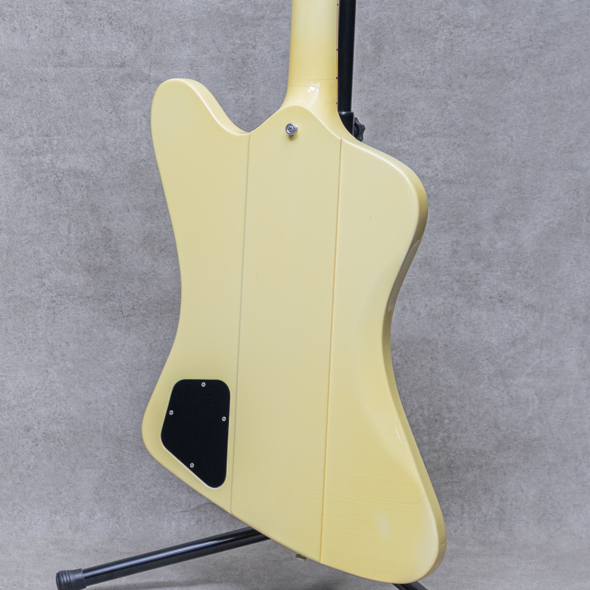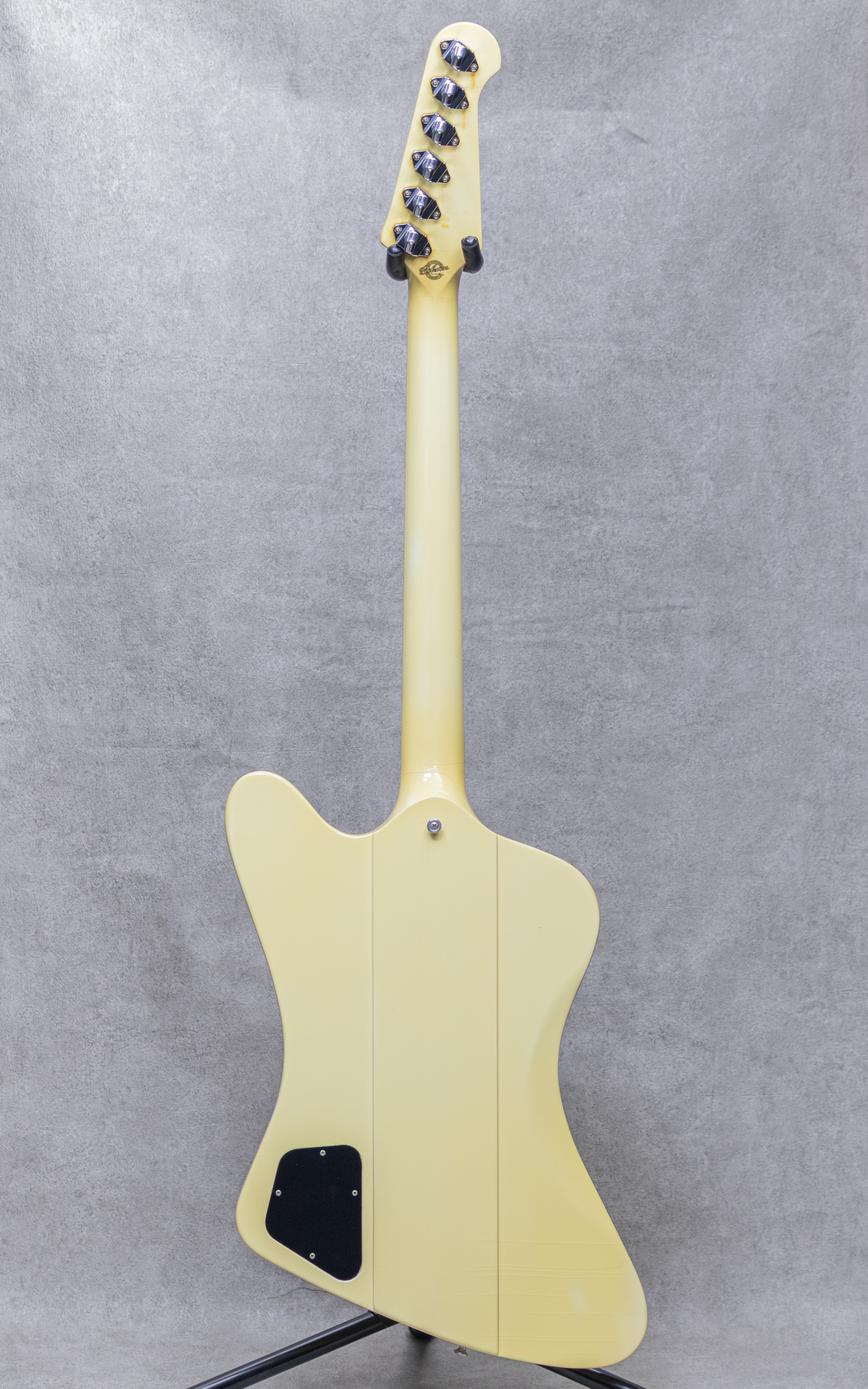 1963年登場のギブソン"Firebird"。当時ほとんど見られなかったスルーネック構造や、流線的なオフセットスタイルのボディシェイプに、中央部と両ウィング部とのボディトップギャップなど、デザイナーによる創造性を強く感じさせる設計もユニークな魅力。"SG"に続きソリッドモデルの幅を広げた"Firebird"は、大幅なデザインチェンジなど異色の経緯を辿りながらも、ギブソンを代表するソリッドモデルの1つとして現在まで愛され続けています。本器は1997年製Gibson Custom Shop "Firebird V"程よく焼けた塗装が雰囲気抜群にかっこいいClassic Whiteカラー。マホガニースルーネック、"リバース"スタイル、バンジョーペグ、"Firebird Small Humbucking"ピックアップ2基搭載、ABR-1ブリッジ&ストップテールピース。Dシェイプ寄りの頂点が少し平らな60年代モチーフの握りやすいネックシェイプ。程よいグリップ感ながら角張った印象は受けずとても弾きやすい形状。搭載されるピックアップは"Les Paul Deluxe"等に搭載される"Mini-Humbucker"とは構造的に異なり、カバー下の2つコイルにそれぞれバータイプの磁性体が配置され、より鋭くアタッキーでエッジの効いたトーンが特徴。本器の通称"リバース"スタイルではペグ配列が一般的な片側6連とは逆になり、巻弦側のタイトな弾き応えも特徴的。なるほどオープンチューニングでもテンションがルーズになり過ぎず、スルーネック構造によるロングサスティーンも相まって、カツーンと響くキャラクター性豊かなグッドサウンド。また本器のような塗りつぶしのカラーでは塗装面が少し厚くなり、僅かにコンプレッションが効いた子気味の良いアタックで、単音単音の粒立ちが心地よくもドライになり過ぎない絶妙なトーン。こちら細かな小傷や擦れなど相応の使用感はあるものの、雰囲気を崩す顕著なダメージはなく、演奏性もとても良好。クリア層が黄色く焼けた雰囲気抜群の色合いに所々横長に走るウェザーチェック、全長の長い"Firebird"らしくヘッドトップには小さな塗装チップもありますが、むしろ貫禄に説得力を感じるほど。ロッドの調整を含め良好なネックコンディションで、フレットも85~90%程をしっかり残し、弾きやすいローアクションのセッティングができております。ノブ4点は60's風のゴールドリフレクタースタイルに交換済み。コントロール部配線にも手が入っており、コンデンサはフロント0.020uF、リア側は0.022uFのセラミックコンデンサで配線されています。扱いやすいストップテールスタイルのV、まだまだしっかり弾きこんでいただきたい1本ぜひご検討ください。オリジナルハードケース付属