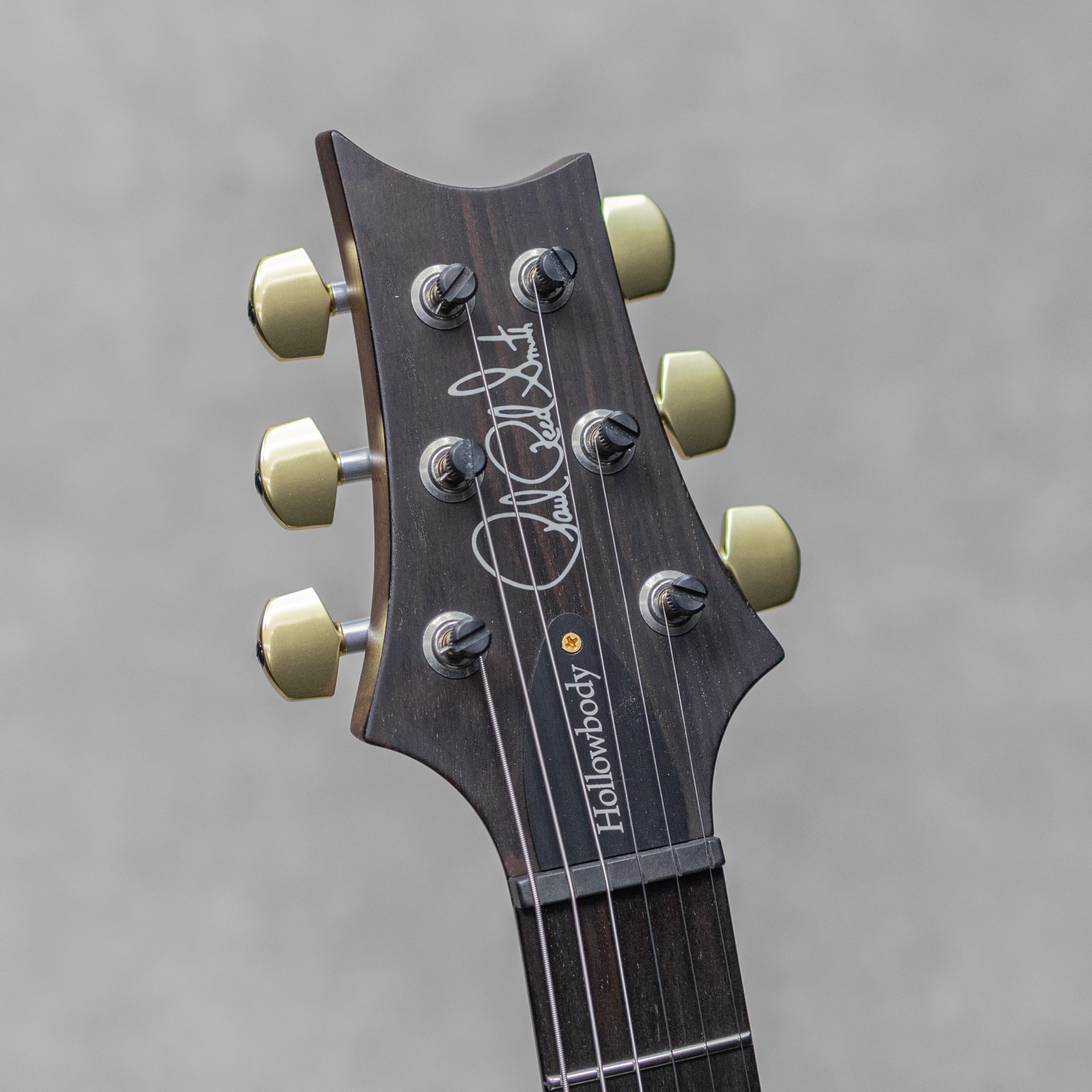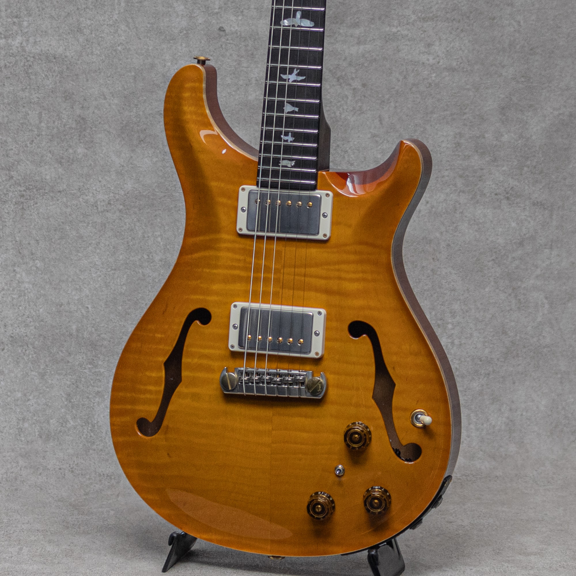 PRS"Hollowbody"はラインナップの中でもよりトラッドな要素を前面に出した"McCarty"モデルから派生する形で登場。1998年からの登場当初は"McCarty Hollobody"と命名されましたが、その後2006年には"Hollowbody"モデルとしてリネーム。現在ではより手に取りやすい価格帯で展開される"SE"シリーズにおいても"SE Hollowbody"が登場するなど、PRSを代表するモデルの1つとなりました。当初よりメイプルトップとチェンバードのマホガニーバックを持つ"Hollowbondy I"、トップとバックにもメイプルを配した"Hollowbody II"、スプルーストップを採用した"Hollowbody Spruce"といった3種類のラインナップにて展開を開始。本器は高品質な木材を有するオーダープログラム"Wood Library"にて、製作された1本。Hollowbody I Piezo Rosewood Neck African Blackwood FB、モデルを象徴する代表的カラーのMcCarty Sunburst。メイプルトップ&マホガニーバックのチェンバードボディ、ローズネック、アフリカンブラックウッド指板、Patternシェイプ、ピックアップには58/15を採用。また本器ではピエゾピックアップのオプションも採用されています。ローズネックらしいクリアに澄んだコシのあるトーン。柔らかく豊かな倍音を含みながらも広いレンジを備えた出力で、ホロウ構造によるエアー感を魅力的に聴かせてくれます。現在は工場出荷時と同じ11-49ゲージにてセットアップ済み。ピエゾピックアップ出力では、しっかりとしたアコースティック感を楽しませてくれるポテンシャルも本器ならではの魅力です。極わずかなハードウェアのくすみ、ボディ表面の細かな擦れ跡やボディエッジの小傷など、多少の使用感はあるものの、目立って外観を損なう傷はありません。フレットの摩耗もほとんど感じられないほどで、ロッドの調整を含め良好なネックコンディション。弾きやすいアクションでセッティングができております。昨今では少し珍しくなった"Hollowbody I"、甘く芳醇なトーンながら、幅広く応用の利くスペックの1本。是非お見逃しなく。オリジナルハードケースが付属