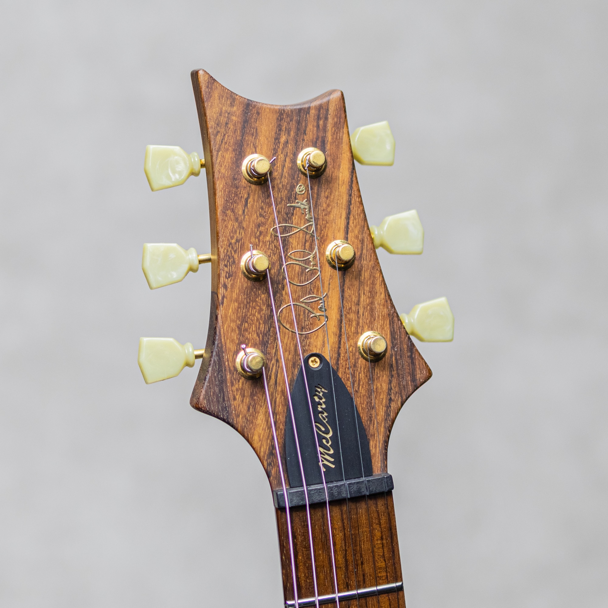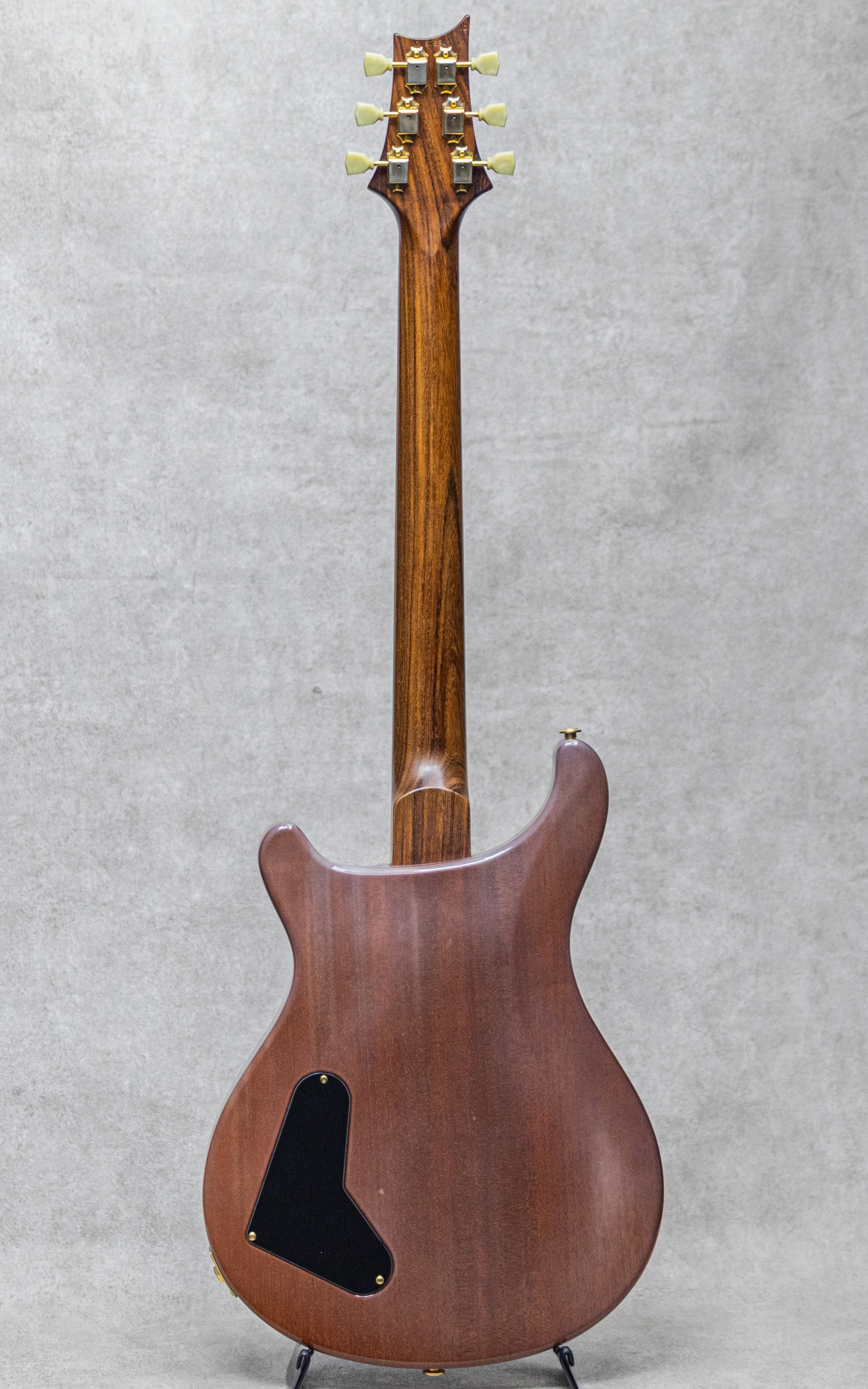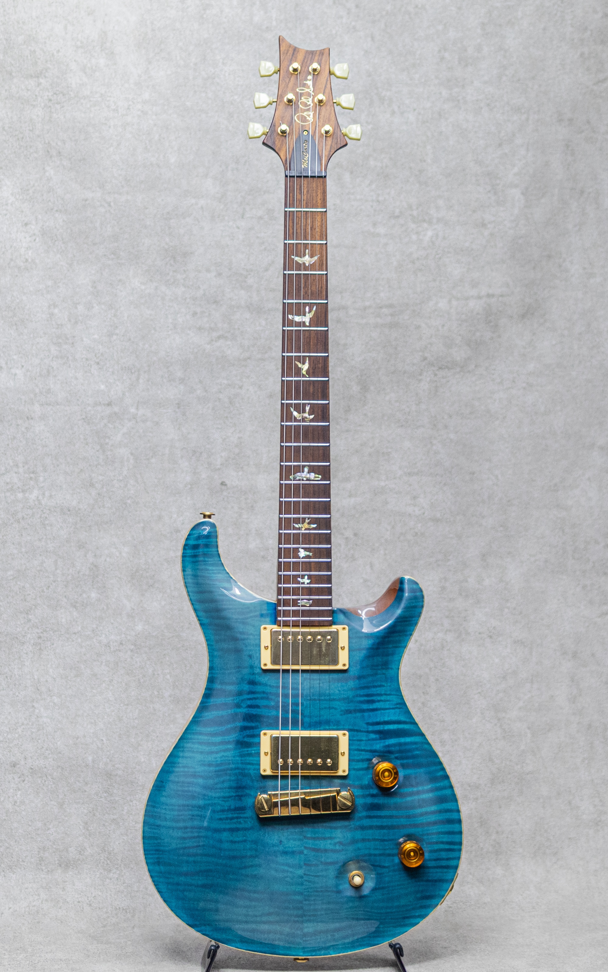1970年代からギター製作に取り組んでいた"Paul Reed Smith"。1984年に本格的な受注を受け、翌1985年にPRS Guitarsを設立。代名詞ともいえるモデル"CUSTOM"に続き、"PRS(Standard)"、"Dragon"等と、氏の夢の体現とも言えるモデルを生み出してきました。1980年代後半に、Gibson黄金期の父"Ted McCarty"を迎えたPRSは、よりヴィンテージフィールに重きを置いたモデル展開にも触手を伸ばし、1993年に"Custom22"を、1994年には本器"McCarty"発表へと至ります。ヴィンテージの持つ空気感とモダンな演奏性を兼ね備えた本モデルは多大なリスペクトと共に人気の定番モデルへとなりました。本器は2001年製"McCarty 1st"、10Topグレードのフィギュアドメイプルにローズウッドネックを採用した1本。心地よい握り応えの"Wide-Fat"ネックプロファイル、ヴィンテージスタイルチューナー、ラップアラウンドブリッジ、ピックアップには"McCarty Treble&Bass"。ローズネックらしく明瞭なレンジ感、太い芯を持ったトーン。倍音豊かで芳醇なトーンながらクリアに抜けるグッドサウンドで、トラッドなキャラクターながらもモダンに洗練された完成度、PRSらしいクオリティを存分に楽しませてくれる1本。こちら全体的な塗装の白濁があるものの、その他は丁寧に扱われてきたことが伺える良好なプレイコンディション。細かな小傷や擦れなど最小限でフレットの顕著な減りもなく弾きやすいセッティングをキープしています。ロッドの調整も含め良好なネックコンディション。まだまだしっかり引き込んでいただけるグッドプレイコンディション。お見逃しなく。オリジナルハードケースが付属
