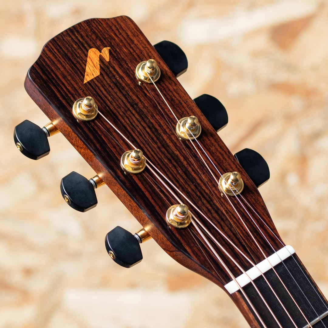フィンガーピッカー向けに開発されたモーリスSシリーズを基に新たなSサウンドを探求し進化を遂げたSEシリーズ。半手工ラインにて製造される国産モーリスギターは各セクション毎に熟練したスタッフによって製造されています。本器はスプルーストップ、マホガニーサイド&バックの”SE-93”。マホガニーネック、エボニー指板、リッチライトブリッジ、ゴトーペグ。ボディシェイプはそのままでトップのXXブレイシングをフォワードシフテッドXに、バックのXブレイシングをラダーブレイシングに変更。バック形状はラウンドバック・スタイルからフラットバック・スタイルに変更しており豊かな鳴りとバランスの取れたサウンドを実現しています。ボリュート加工や新しいネックシェイプ、ハイポジションでの演奏性をさらに高めるためにネックヒールのエッジを丸くしたりとサウンド面でだけでなく演奏面等での拘りも感じられます。新たな進化を遂げたSEシリーズ。ぜひお試しください。