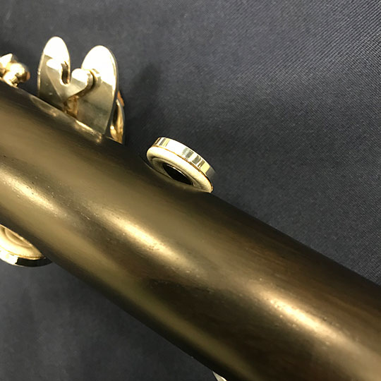 タンポは、ホワイトレザーパッド、ゴアテックスパッド、コルクパッドを各部に理想的な配置で装着。水滴による劣化やタンポによるノイズの不具合を極力軽減しています。下管の大きいタンポはメタルレゾネータ付きのホワイトレザーを使用しています。
