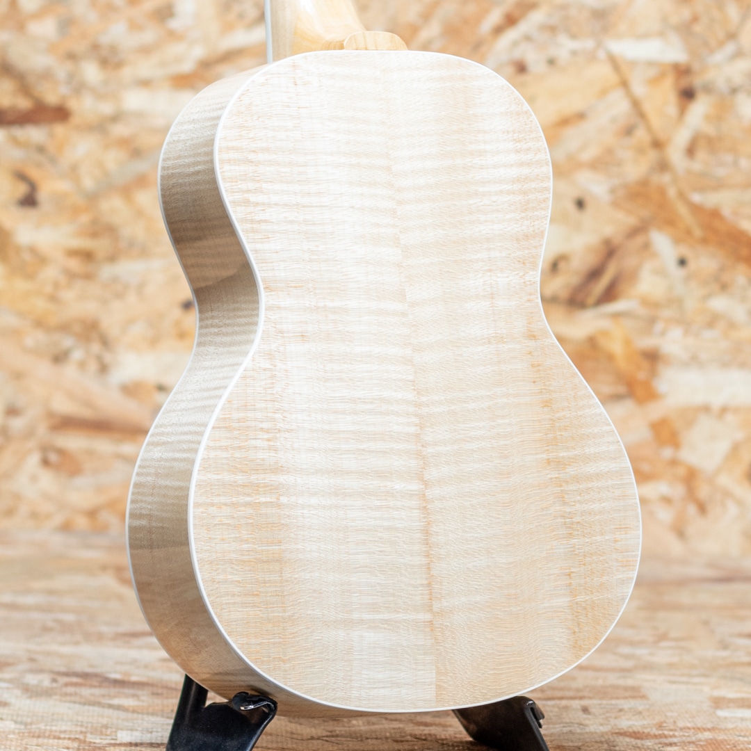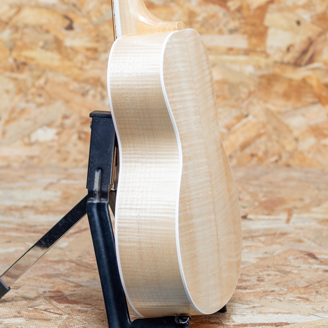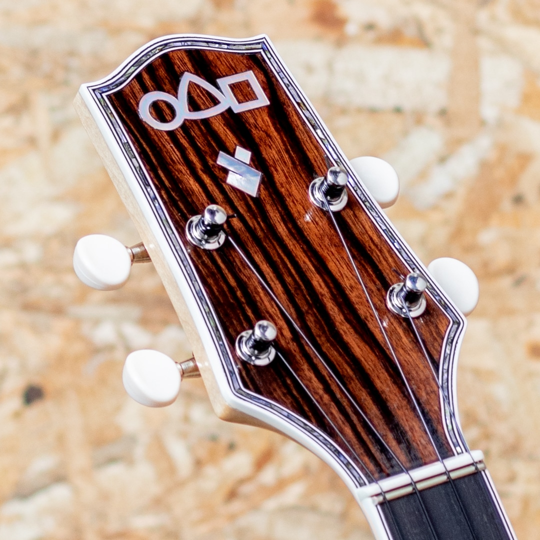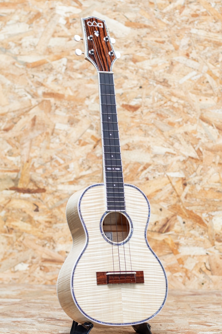 京都市の工房にて占部英明氏、息子の直宏氏によって製作されるハンドメイドウクレレ。本器はウクレレプレイヤー”名渡山遼”氏が愛用していることで有名な”ビッグ・テナー”サイズの1本。きれいな杢のシカモアボディ、菩提樹ネック、ローズウッドブリッジ、ホワイトバインディング、アバロントリム、アバロンロゼッタ、グローバー製ギヤペグ。ステージなどでも映える、アバロンの入ったビッグヘッドを採用。存在感たっぷりなルックスです。容積の大きなボディでエアー感のあるふくよかなサウンド。占部ウクレレ特有のやや薄めで握り易いネックシェイプ、0フレット仕様でローポジションの弾き易さは格別。14フレットジョイント仕様で演奏性も高く、一般的なテナーサイズよりも長い442mmスケールを採用することで、音色のハリ、音量、安定感は占部全サイズの中でもダントツに優れております。ストラミングでも単音でも、しっかりとした反応で応えてくれる、プロ志向モデル。美しいシカモアの杢とアバロンの装飾がマッチした高級感のある1本です。