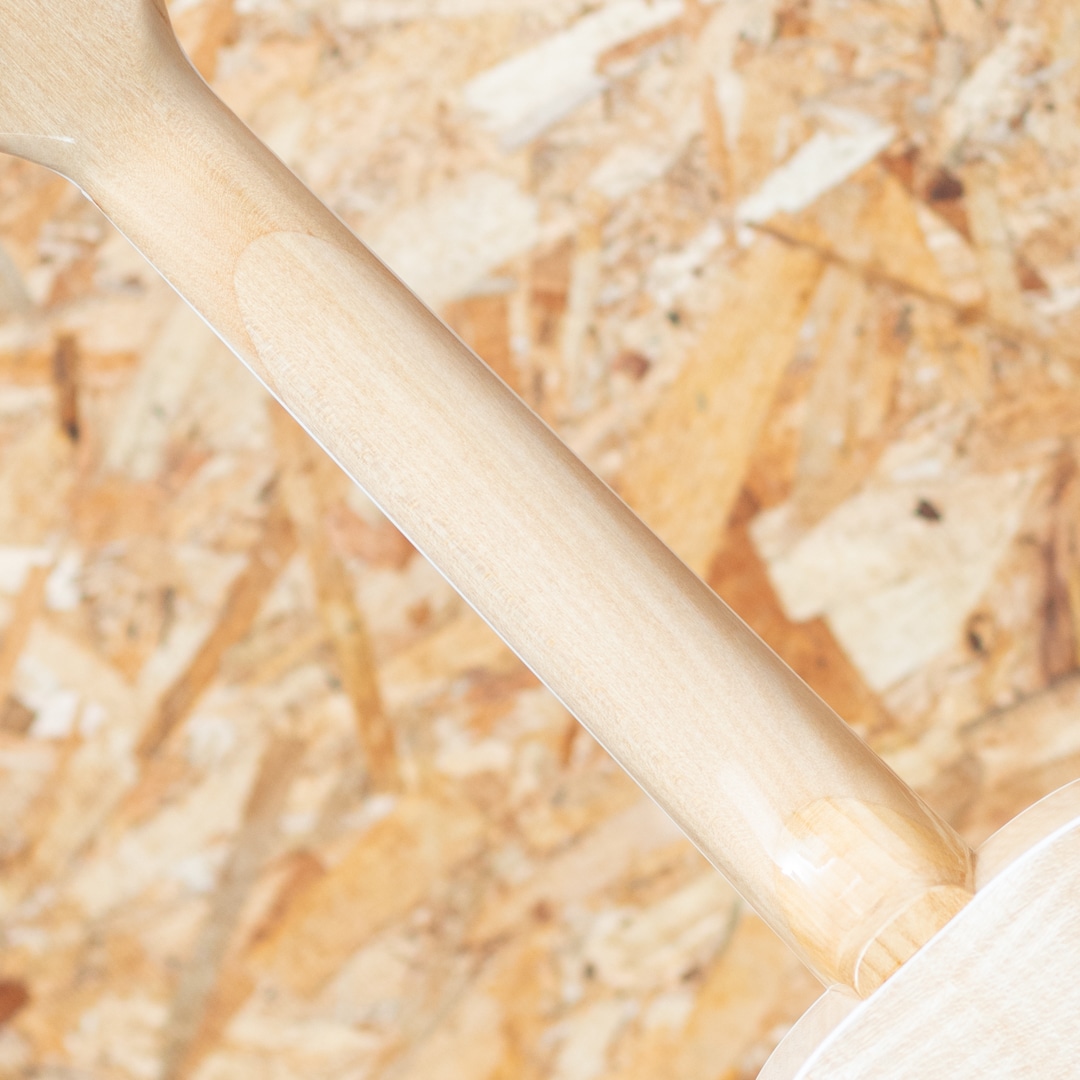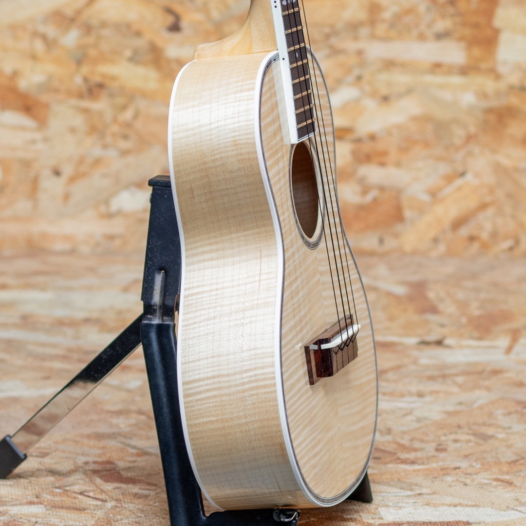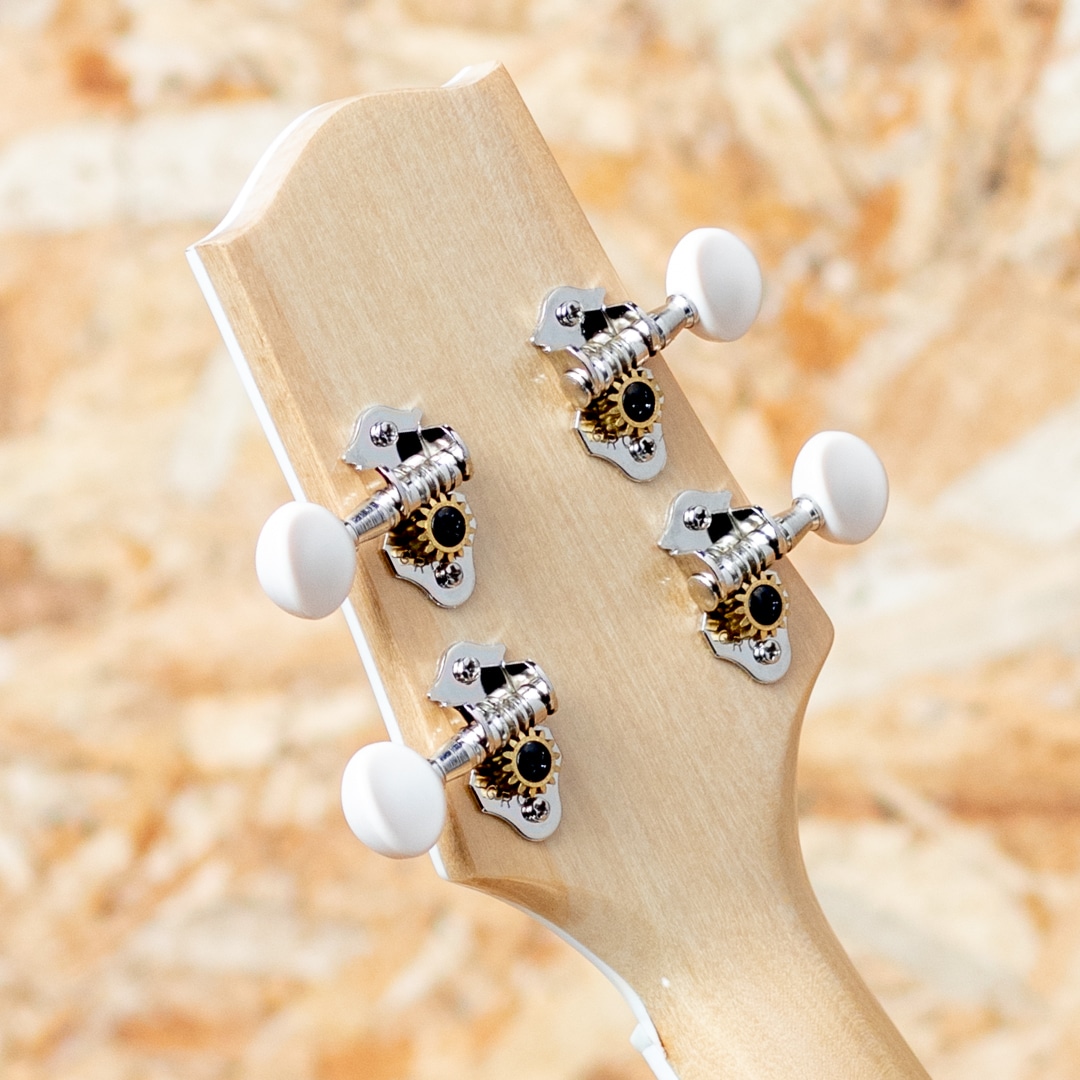 京都市の工房にて占部英明氏、息子の直宏氏によって製作されるハンドメイドウクレレ。本器はウクレレプレイヤー”名渡山遼”氏が愛用していることで有名な”ビッグ・テナー”サイズの1本。きれいな杢のシカモアボディ、菩提樹ネック、ローズウッドブリッジ、ホワイトバインディング、アバロントリム、アバロンロゼッタ、グローバー製ギヤペグ。ステージなどでも映える、アバロンの入ったビッグヘッドを採用。存在感たっぷりなルックスです。容積の大きなボディでエアー感のあるふくよかなサウンド。占部ウクレレ特有のやや薄めで握り易いネックシェイプ、0フレット仕様でローポジションの弾き易さは格別。14フレットジョイント仕様で演奏性も高く、一般的なテナーサイズよりも長い442mmスケールを採用することで、音色のハリ、音量、安定感は占部全サイズの中でもダントツに優れております。ストラミングでも単音でも、しっかりとした反応で応えてくれる、プロ志向モデル。美しいシカモアの杢とアバロンの装飾がマッチした高級感のある1本です。