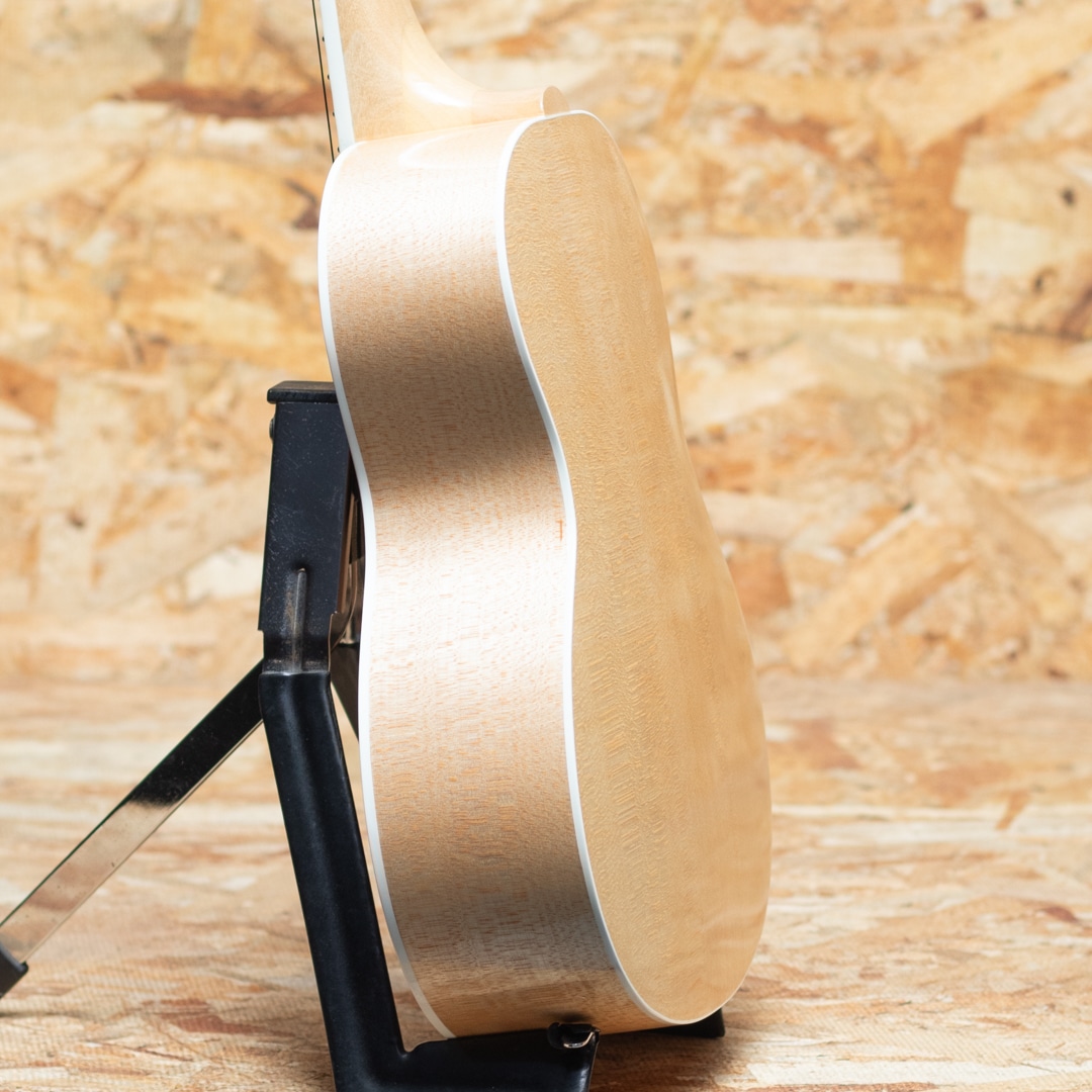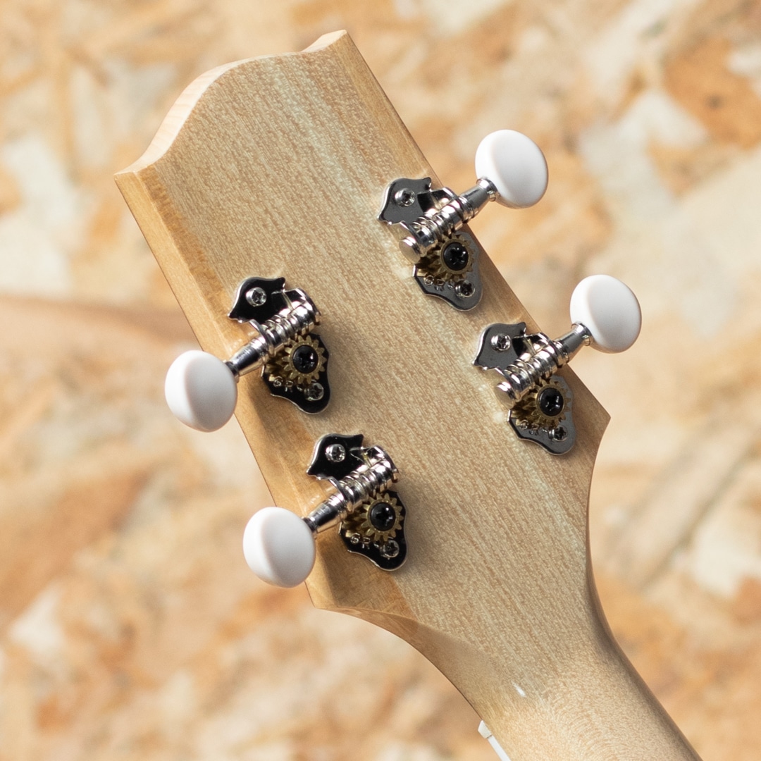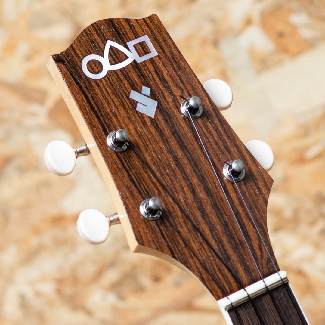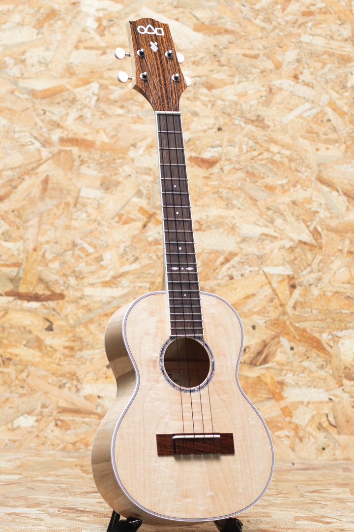 京都市の工房にて占部英明氏、息子の直宏氏によって製作されるハンドメイドウクレレ。本器はウクレレプレイヤー”名渡山遼”氏が愛用していることで有名な”ビッグ・テナー”サイズの1本。メイプルボディ、菩提樹ネック、ウェンジ指板、ローズウッドブリッジ、ホワイトバインディング、アバロンロゼッタ、グローバー製ギヤペグ。容積の大きなボディでエアー感のあるふくよかなサウンド。占部ウクレレ特有のやや薄めで握り易いネックシェイプ、0フレット仕様でローポジションの弾き易さは格別。14フレットジョイント仕様で演奏性も高く、一般的なテナーサイズよりも長い442mmスケールを採用することで、音色のハリ、音量、安定感は占部全サイズの中でもダントツに優れております。ストラミングでも単音でも、しっかりとした反応で応えてくれる1本です。