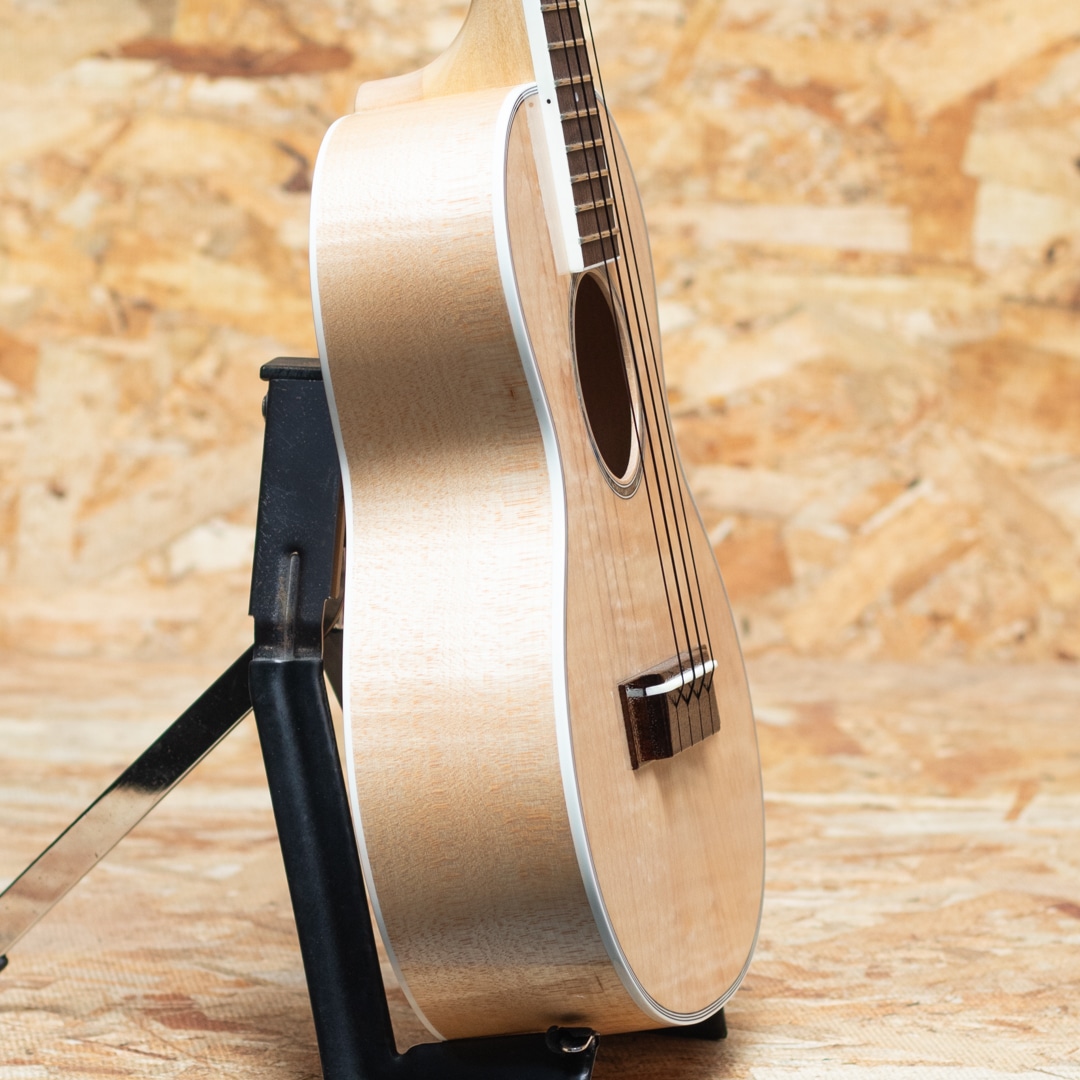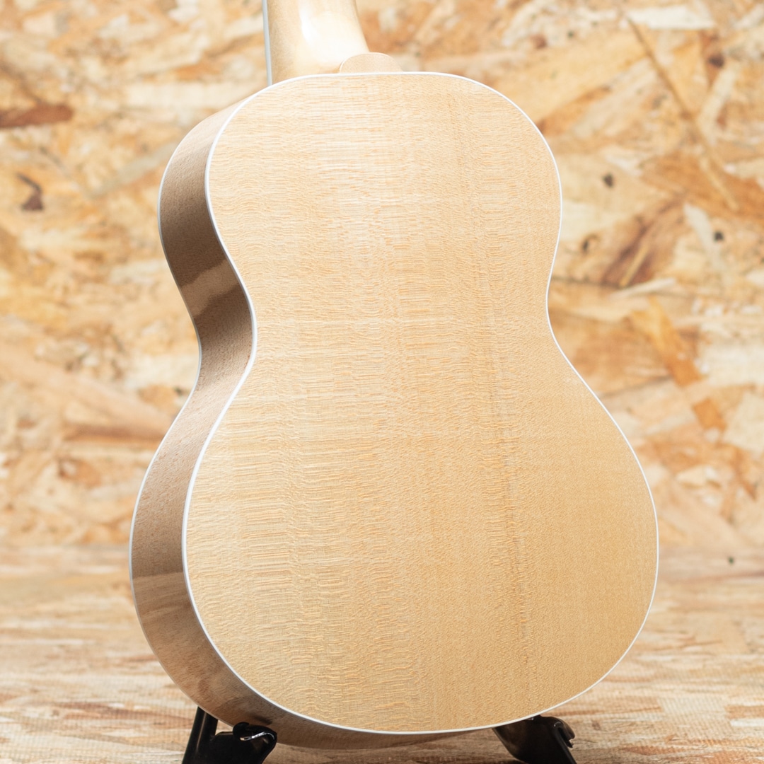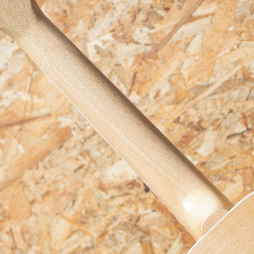 京都市の工房にて占部英明氏、息子の直宏氏によって製作されるハンドメイドウクレレ。本器はウクレレプレイヤー”名渡山遼”氏が愛用していることで有名な”ビッグ・テナー”サイズの1本。メイプルボディ、菩提樹ネック、ウェンジ指板、ローズウッドブリッジ、ホワイトバインディング、アバロンロゼッタ、グローバー製ギヤペグ。容積の大きなボディでエアー感のあるふくよかなサウンド。占部ウクレレ特有のやや薄めで握り易いネックシェイプ、0フレット仕様でローポジションの弾き易さは格別。14フレットジョイント仕様で演奏性も高く、一般的なテナーサイズよりも長い442mmスケールを採用することで、音色のハリ、音量、安定感は占部全サイズの中でもダントツに優れております。ストラミングでも単音でも、しっかりとした反応で応えてくれる1本です。