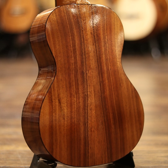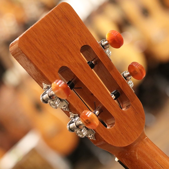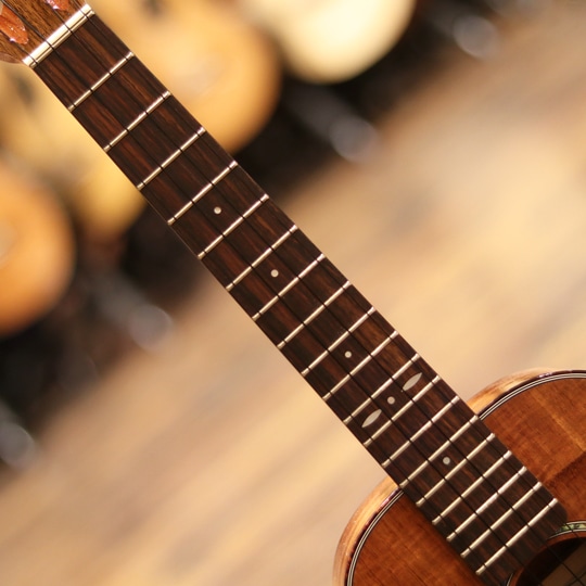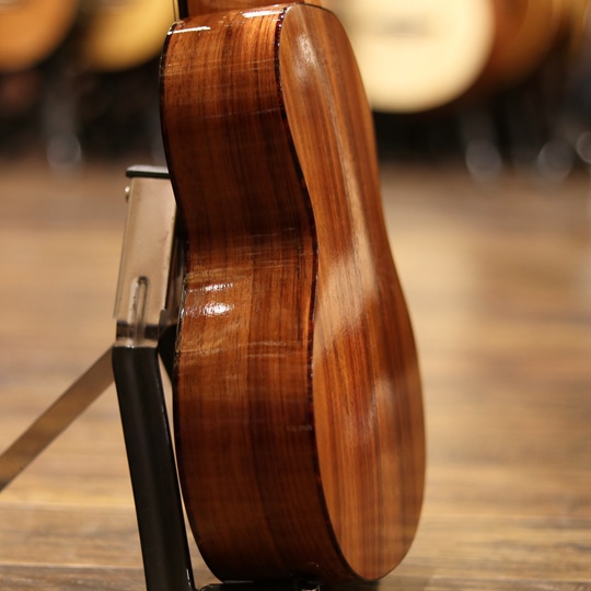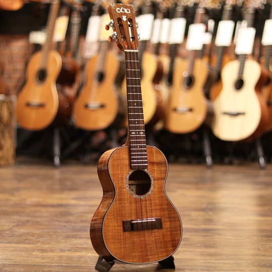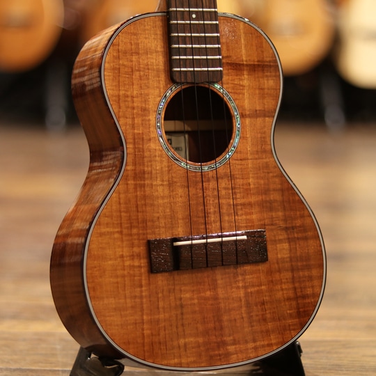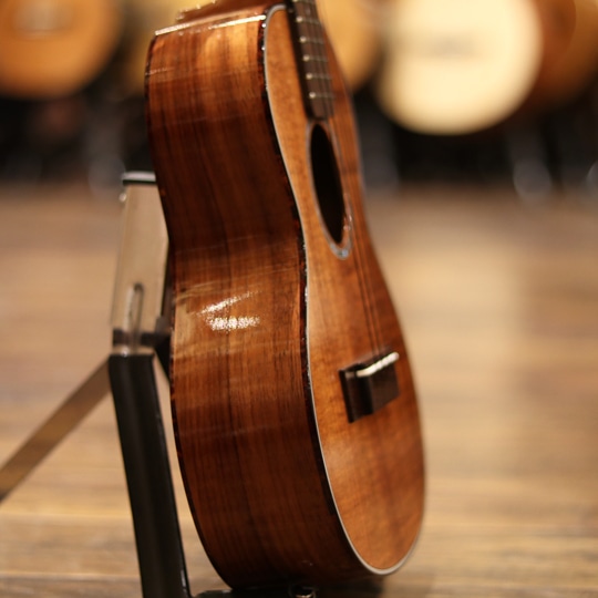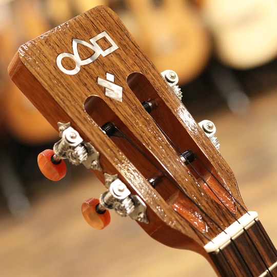 京都市の工房にて占部英明氏、息子の直宏氏によって製作されるハンドメイドウクレレ。本器はウクレレプレイヤー”名渡山遼”氏が愛用していることで有名なサイズ”ビッグ・テナー”シェイプの1本。ハワイアンコアボディ、ホンジュラスマホガニーネック、ローズウッド指板&ブリッジ、アバロンロゼッタ、グローバー製ギヤペグ、スロテッドヘッド仕様。占部ウクレレ特有のやや薄めで握り易いネックシェイプ、0フレット仕様でローポジションの弾き易さは格別。14フレットジョイント仕様で演奏性も抜群です。一般的なテナーモデルより僅かに大きく、スケールも長いため、大音量かつ安定性に優れ、ソロウクレレに最適な仕様の1本。手が小さな方には少し難易度が高くなってしまいますが、楽器としての精度は非常に高いため、弾きこなせれば最高の相棒となるでしょう。