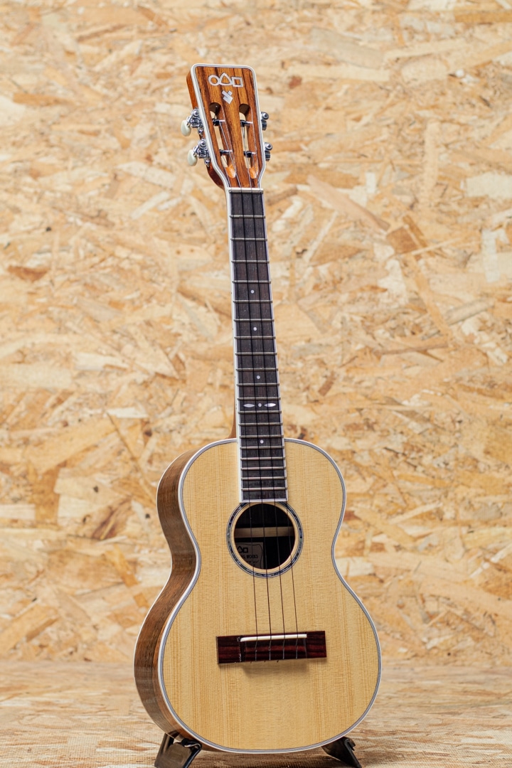 京都市の工房にて占部英明氏、息子の直宏氏によって製作されるハンドメイドウクレレ。本器はウクレレプレイヤー”名渡山遼”氏が愛用していることで有名な”ビッグ・テナー”サイズの1本。占部ウクレレ特有のやや薄めで握り易いネックシェイプ、0フレット仕様でローポジションの弾き易さは格別。14フレットジョイント仕様で演奏性も高く、一般的なテナーサイズよりも長い442mmスケールを採用することで、音色のハリ、音量、安定感は占部全サイズの中でもダントツに優れております。ストラミングでも単音でも、しっかりとした反応で応えてくれる1本です。手が小さな方には少し難易度が高くなってしまいますが、楽器としての精度は非常に高いため、弾きこなせれば最高の相棒となるでしょう。
