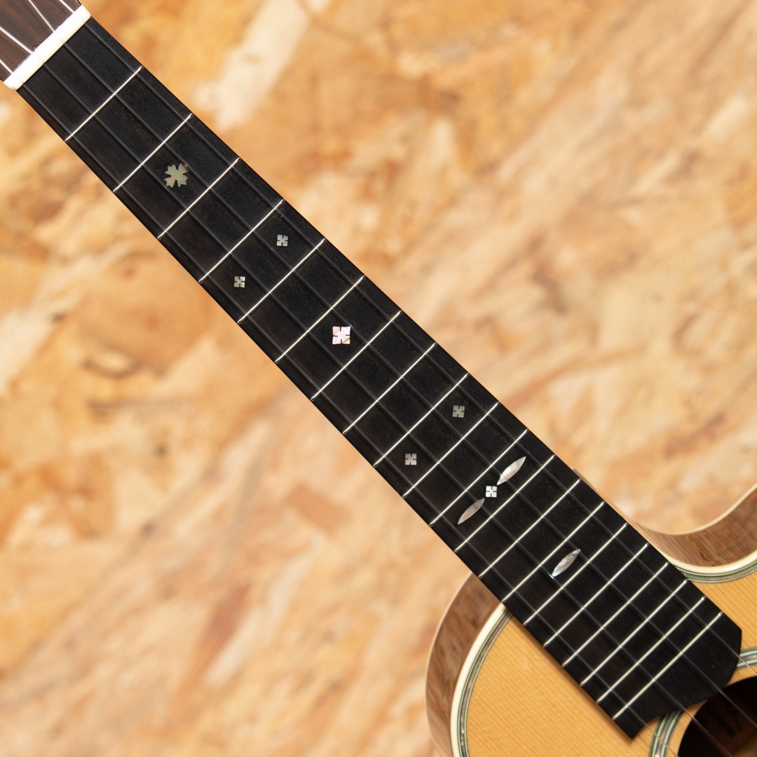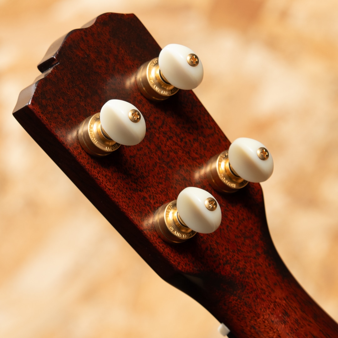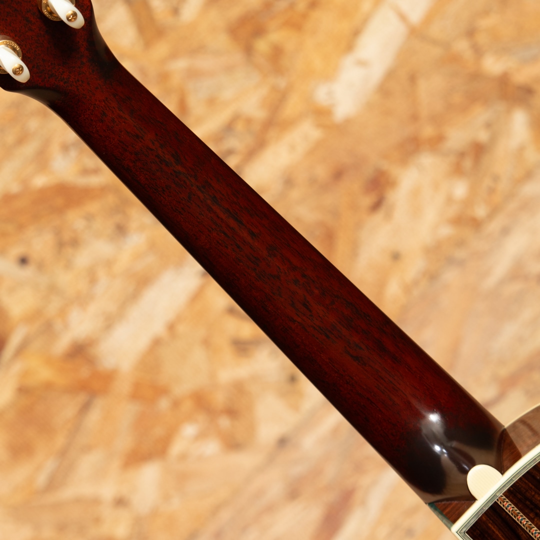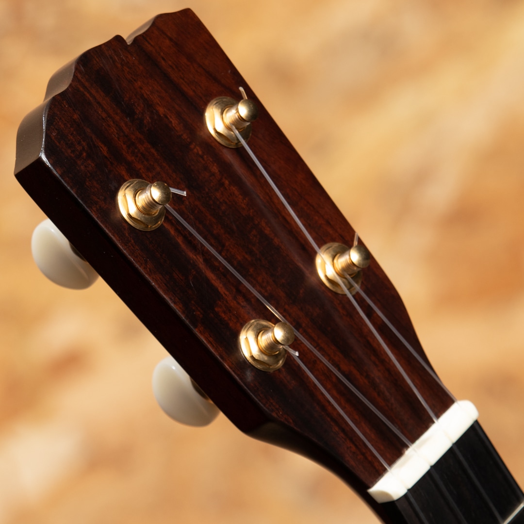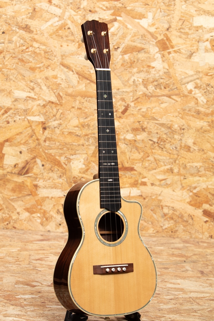 国内有数のベテラン作家"塩崎雅亮"の作品。国内におけるビンテージマーチン研究家の第一人者です。修理や研究から得た膨大な情報や資料、経験は国内随一となります。このウクレレはプライベートブランドであるM.Shiozakiネームで製作された初のテナーウクレレとなる2021年製USED品。モダンスタイルのカッタウェイモデル。師のコダワリと挑戦が盛り込まれた、まさに至極の逸品と呼べる一本です。テナーカッタウェイ14フレットジョイント、トップには上質な赤エゾ松、ローズウッドサイドバック、ホンジュラスマホガニーネック、エボニー指板、アマゾンローズウッドブリッジ、スノウフレイクスパターンのアバロン指板インレイ、ネックボディーにはアイボロイドセルバインディング、トップバックボディーパーフリング、そしてロゼッタにはソリッドのジャパニーズアバロンを使用、高性能Gotoh製プラネタリーUPTチューナー、指板エンドはM.Shiozakiオリジナルのカーブデザインです。ブレイシングは3Lineファンブレイシング、サウンドホールから覗くとバックセンターにブランド焼き印が施されています。サイドバックに使われているローズウッドエキゾチックで魅力的な杢目です。サウンドメイキングはギターの40番台を意識した倍音を取り入れたとの事。45モデルにナイロン弦を張ったような想像を掻き立ててくれる音色で、しっとりかつクリアな倍音がとてもリッチな気分にさせてくれます。全体的に使用感は極薄。目立つキズや打痕等は見当たらず大変丁寧に使用されてきた事が伺えます。非常にレアな塩崎メイドのテナーウクレレです。ギターマニアのM.Shiozakiファンの方、個人製作家の希少なウクレレ好きの方はぜひお見逃しなく。ハードケース付属