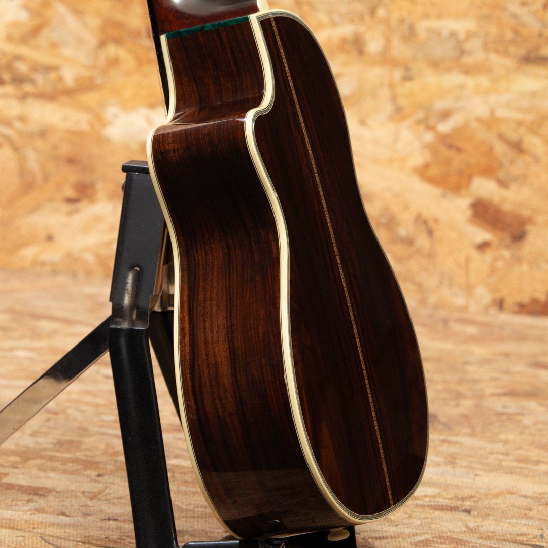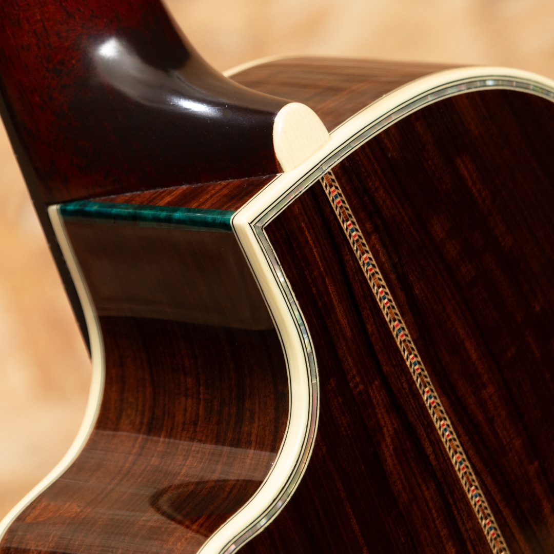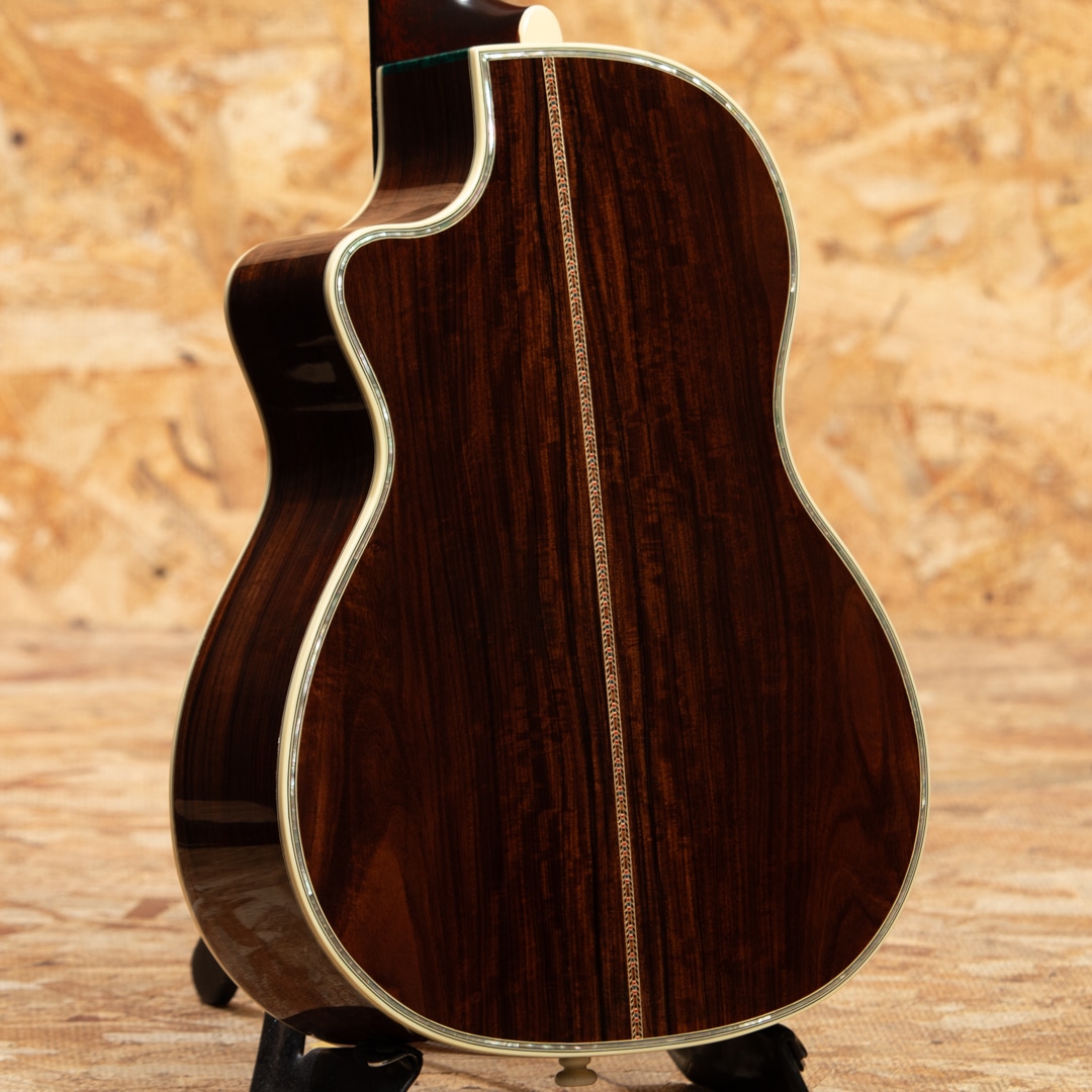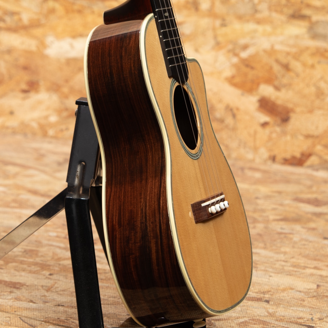 国内有数のベテラン作家"塩崎雅亮"の作品。国内におけるビンテージマーチン研究家の第一人者です。修理や研究から得た膨大な情報や資料、経験は国内随一となります。このウクレレはプライベートブランドであるM.Shiozakiネームで製作された初のテナーウクレレとなる2021年製USED品。モダンスタイルのカッタウェイモデル。師のコダワリと挑戦が盛り込まれた、まさに至極の逸品と呼べる一本です。テナーカッタウェイ14フレットジョイント、トップには上質な赤エゾ松、ローズウッドサイドバック、ホンジュラスマホガニーネック、エボニー指板、アマゾンローズウッドブリッジ、スノウフレイクスパターンのアバロン指板インレイ、ネックボディーにはアイボロイドセルバインディング、トップバックボディーパーフリング、そしてロゼッタにはソリッドのジャパニーズアバロンを使用、高性能Gotoh製プラネタリーUPTチューナー、指板エンドはM.Shiozakiオリジナルのカーブデザインです。ブレイシングは3Lineファンブレイシング、サウンドホールから覗くとバックセンターにブランド焼き印が施されています。サイドバックに使われているローズウッドエキゾチックで魅力的な杢目です。サウンドメイキングはギターの40番台を意識した倍音を取り入れたとの事。45モデルにナイロン弦を張ったような想像を掻き立ててくれる音色で、しっとりかつクリアな倍音がとてもリッチな気分にさせてくれます。全体的に使用感は極薄。目立つキズや打痕等は見当たらず大変丁寧に使用されてきた事が伺えます。非常にレアな塩崎メイドのテナーウクレレです。ギターマニアのM.Shiozakiファンの方、個人製作家の希少なウクレレ好きの方はぜひお見逃しなく。ハードケース付属