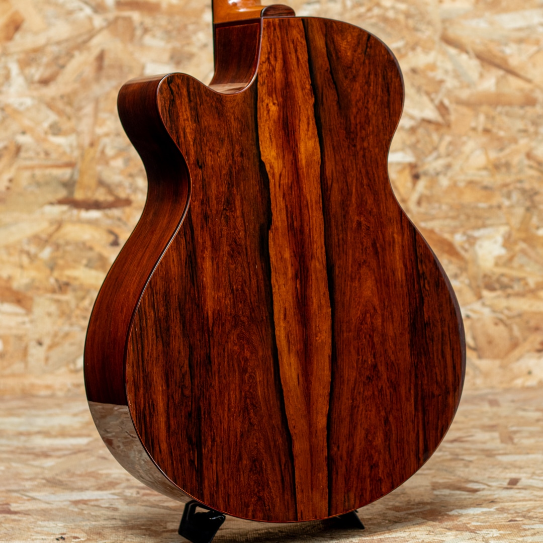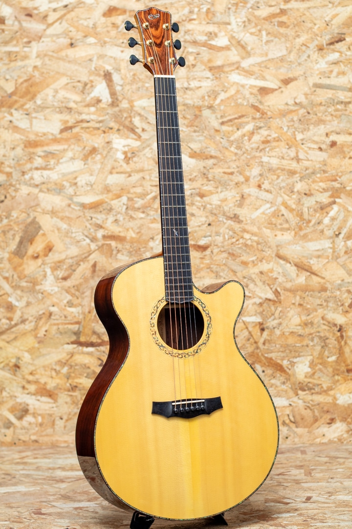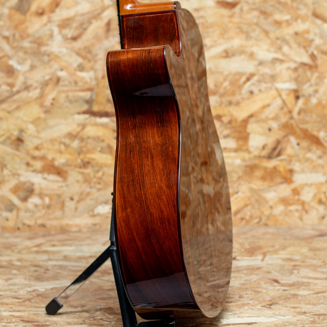 ニュージーランド北島の最北端にある、原生林と農地に囲まれたパラオアヌイ渓谷に工房を構えるギタービルダー"ローリー・ウィリアムズ"。1993年から本格的に楽器製作を始め、これまで数々のギターショウに出展し、現在では世界中のギター愛好家、プレイヤー、そして他のルシアーからも高い評価を得ています。本器はニュージーランドの鳥の名前"Tui"と名付けられたOOOサイズ程のボディのカッタウェイモデル。ヨーロピアンスプルーストップ、マダガスカル・ローズウッドサイド&バック、トタラネック、エボニー指板&ブリッジ、マッカーサーエボニーバインディング、ゴトー製510ゴールドペグ、Xブレーシング。ヘッドの表裏の突板にはマダガスカルキングウッドが用いられ、随所に光る貝の装飾にはニュージランドパウアを使用。トーンコントロールと軽量化を狙い、ブレーシング材はデザインカットで空洞化されております。ネック材にはホンジュラスマホガニーと同等の良材としてニュージーランド産のトタラを使用。ボディ材は均一に目が詰まった上質なヨーロピアンスプルース、そして黒い心材部を含んだ濃密なマダガスカルローズウッドの組み合わせ。安定の良い低域と華やかな高域がバランスよく響き、心地よいトーンを味わえます。2007年製の個体のため僅かな塗装の引きが見られますが、全体的に特に目立ったキズなどは見られず、とても美しい状態です。ネックのコンディション、セットアップも大変良好。ルシアーメイドらしい上質な響きをご堪能ください。オリジナルハードケース付属。
