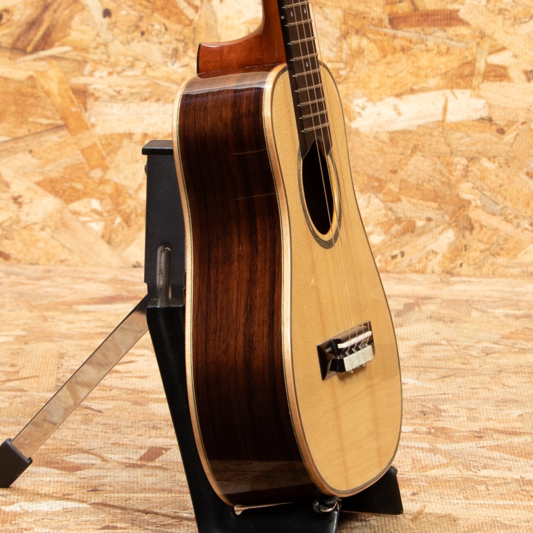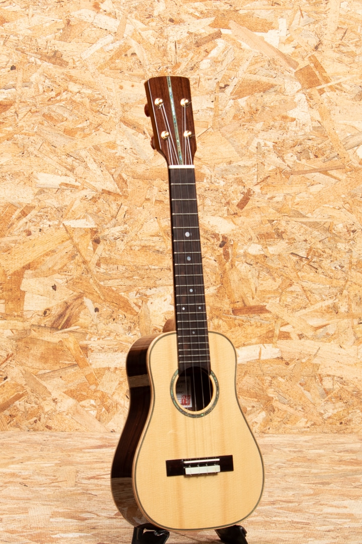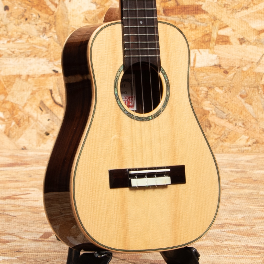 1947年茨城県の日立市生まれ。10代よりギターの製作を始め、1969年には独立して所沢に工房を設立。今や日本を代表する製作家の一人です。本器は西野春平氏が手掛けるベルシェイプコンサートウクレレ”NR3”。ジャーマンスプルーストップ、ローズウッドサイド&バック、ローズウッド&アバロンインレイヘッド化粧板、マザーオブパールドット指板インレイ、エボニー指板、ホンジュラスマホガニーネック、ハカランダブリッジ、アヴァロンロゼッタインレイ、メイプルバインディング、ゴトープラネタリーペグ。クラシックギターにも通ずる材の組み合わせを採用したこちらのウクレレはベルシェイプボディからなる音の太さも相まって非常に豊かで伸びやかな音像と豊かな余韻をお楽しみいただけます。また、ブリッジ形状や氏自らが深碧色に染め上げたパーフリング材によるバインディングの飾りがクラシカルかつ高級感のある趣に仕上がっており、音も見た目も楽しめる一品です。ソロウクレレや1音1音を大切にしたいプレイヤーにおすすめです。ギグケースが付属いたします。