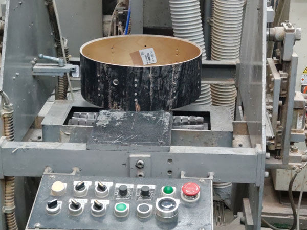 スネアドラムのスナッピーのあたりを良くするためにスナッピーのちょうど当たるシェルエッジを専用機械により切削します。画像の通り平らな台に置きましたら削られているのが分かりますね!