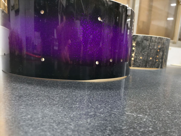 まずは粉を接着させる前に下地の塗装をします。(*画像の黄色いシェル)粉の内側のカラーにより明るい・暗めなどスパークルした後の色目を変えることができます。もちろんバスドラムのフープのスパークリングもこちらで行います。