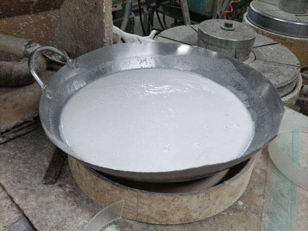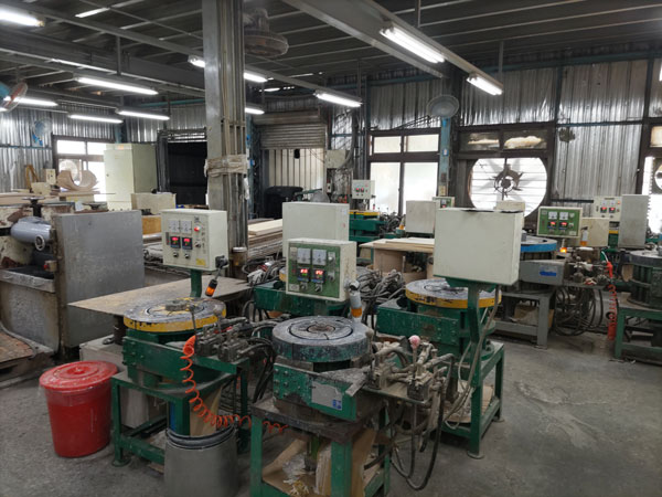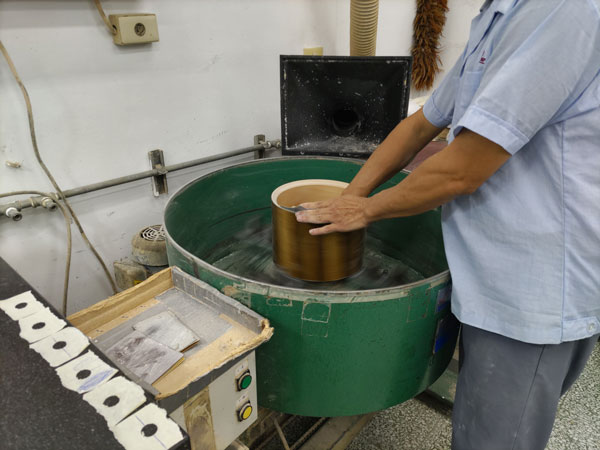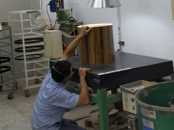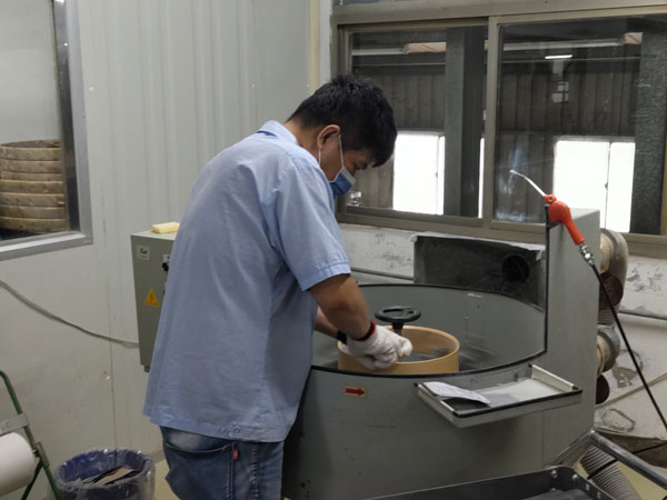 平板を真円にする接着面の端を人力と専用機械の両方で削って接着しやすいように加工します。