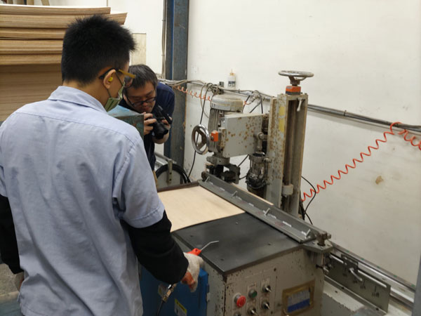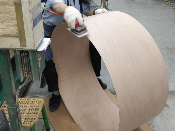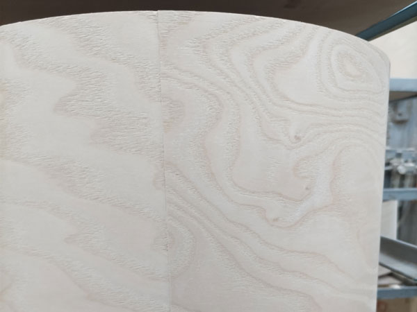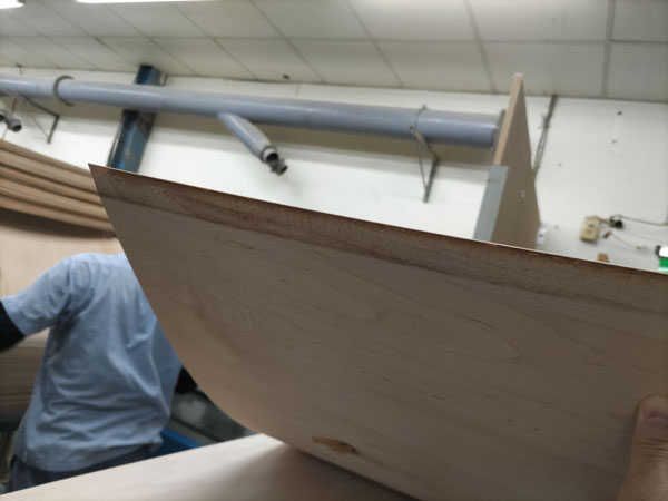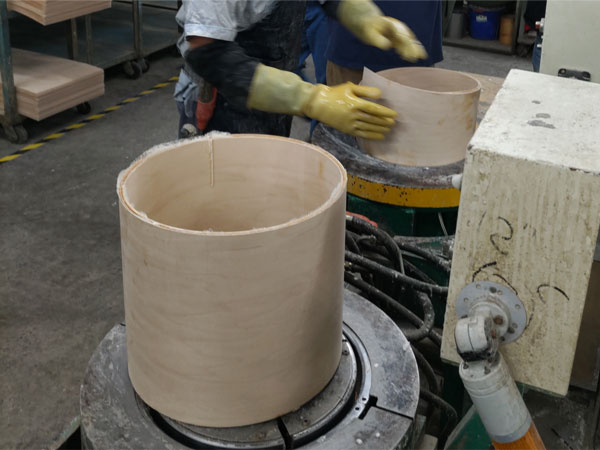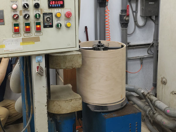まずは節のない平板を1日ぐらい水に浸して柔らかくしてから、専用機械の中に入れて電子レンジのように高周波をおよそ15分ほど当てて木材の中の水分を飛ばします。