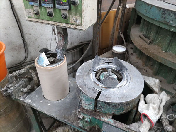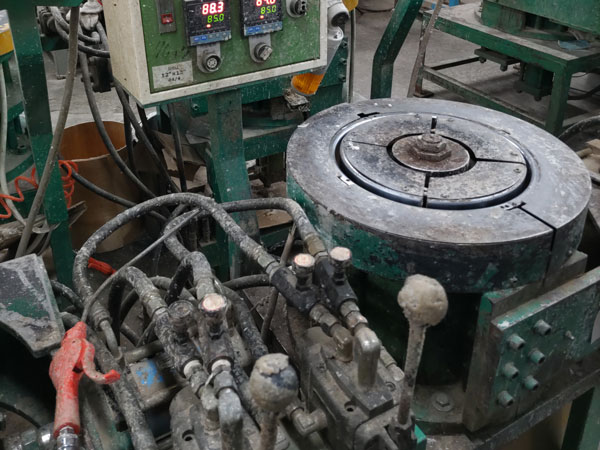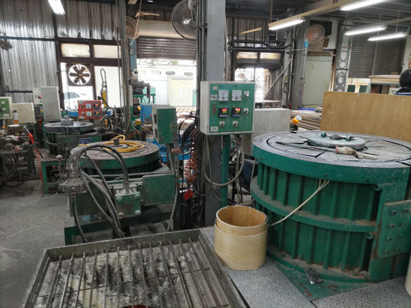 柔らかくなった平板を、真ん中に真円の型入れて人力で二人がかりで一気に曲げます。その作業は圧巻でした。