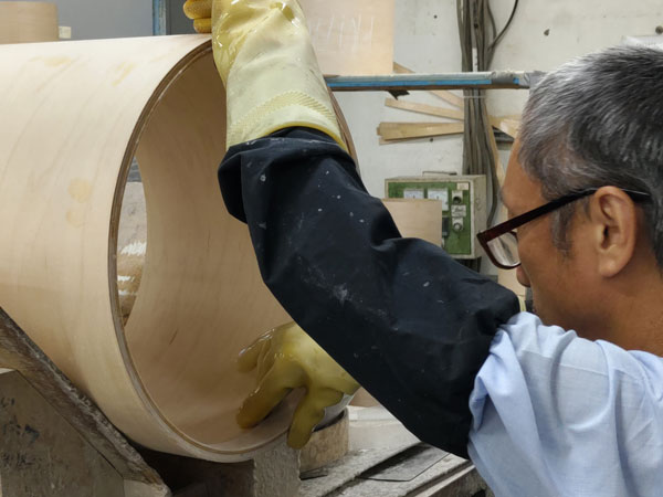 単板シェルはこんなに手間をかけて製造されているのですね。通りで納期がかかるわけです。