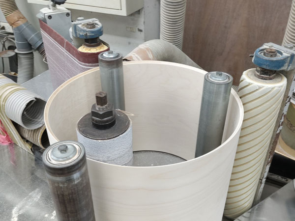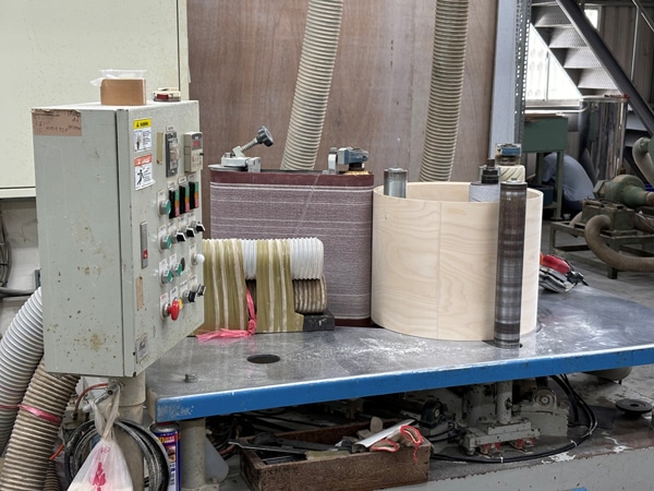 真円になったシェルを適正なサイズにカットします。カットされた断面を専用機械で削りドラムサウンドの生命線である『エッジ加工』を施します。惜しみなく撮影可能でした。