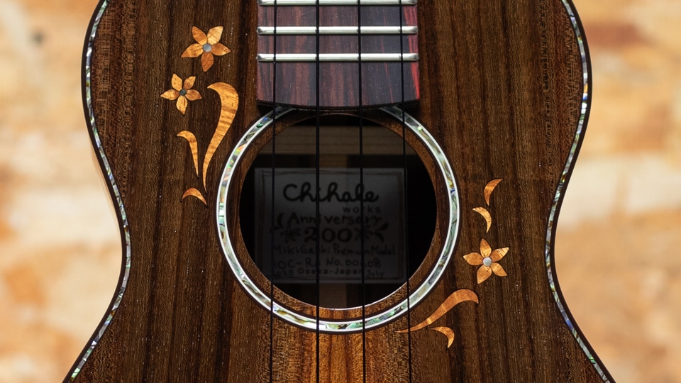 本器は、三木楽器創業200周年を記念して製作いただいた特別モデル。Chihale Works初の試みとなるオールローズウッドボディを採用したコンサートサイズウクレレです。ホンジュラスマホガニーネック、ローズウッド指板&ブリッジ、ローズウッドナット、牛骨サドル、ゴトー製UPTペグを搭載。アバロンのロゼッタとボディトリム、ブラウンセルのバインディングが美しく調和しています。 さらにロゼッタ周囲には、ハワイアンコア材とアバロンによるフラワーインレイが施され、チハレレならではの美意識と遊び心が感じられます。