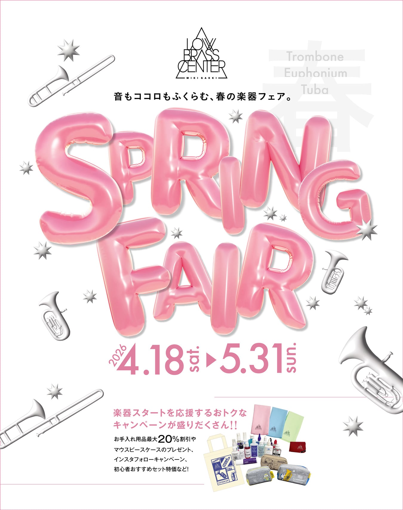 お手入れ用品最大20%割引やマウスピースケースのプレゼント、インスタフォローキャンペーン、初心者おすすめセット特価など、楽器スタートを応援するおトクなキャンペーンが盛りだくさん!