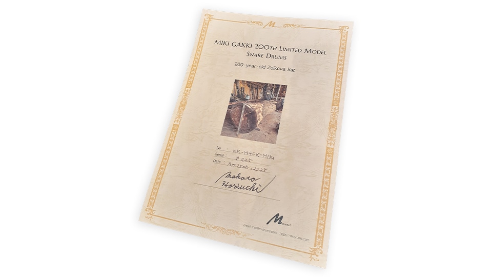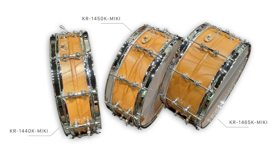 MIKI GAKKI創業200周年を記念して、Mdrums社に『樹齢200年の木材』を探していただき特別に14"x4", 14"x5", 14"x6.5"の3サイズ、各サイズ1台ずつ製作して頂いたスペシャルな個体です。
