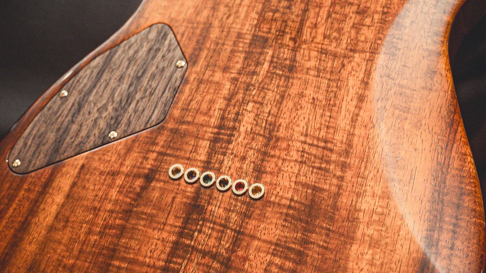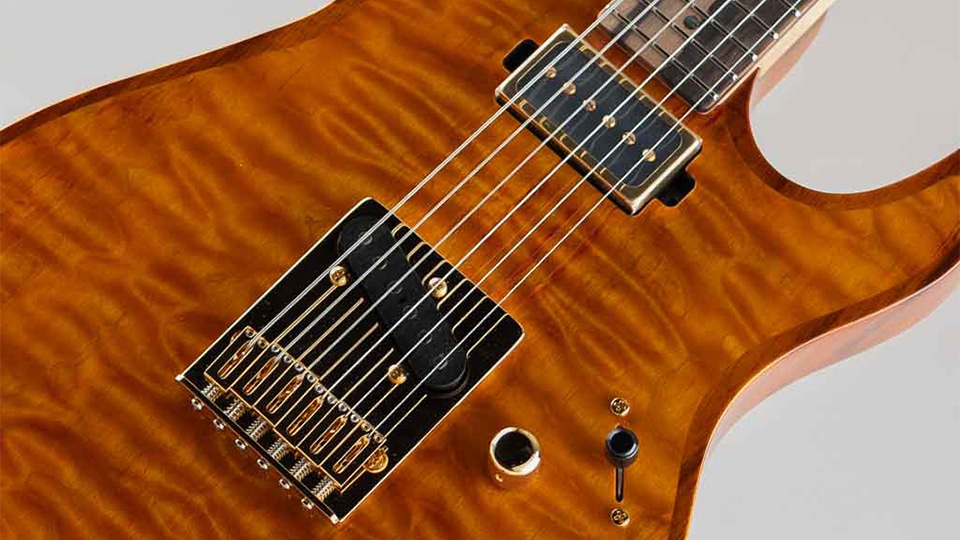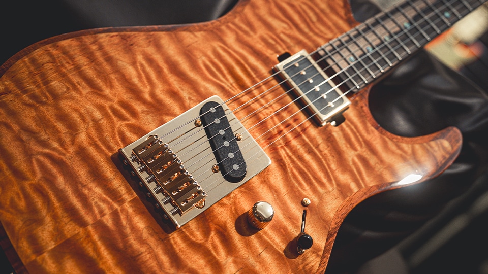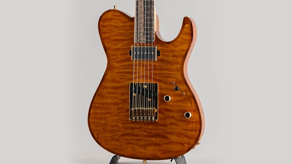 テレキャスターシェイプを基としたフラグシップモデルExpert ILIAD(EIL)をベースに細部にまでこだわったMVIL200SQM。ボディは見るものを魅了する鮮やかな5Aスポルテッドキルトメイプルトップ、バック材にはアカシアコアといったいずれも希少な銘木を使用。ボディトップは通常の貼り合わせとは異なり、バック材を中抜きしトップ材を落とし込むFUJIGENの伝統技法である入れ子構造を採用。過去Virtuosoシリーズにのみ行われていたFUJIGENの伝統技法を、今回特別にリクエストし製作いただきました。よりタイトに、より鳴りを活かした職人の技術が垣間見えます。ネックには杢が美しく剛性にも優れたタイムレスティンバーカーリーメイプルとホワイトエボニー指板を贅沢に採用。他には無い木材の組み合わせにより美しいルックスはもちろんのことですが、色彩豊かなサウンドもお楽しみいただける仕様となっております。今回の木材は全て現地にて数多くある銘木からハンドセレクトさせていただきました。