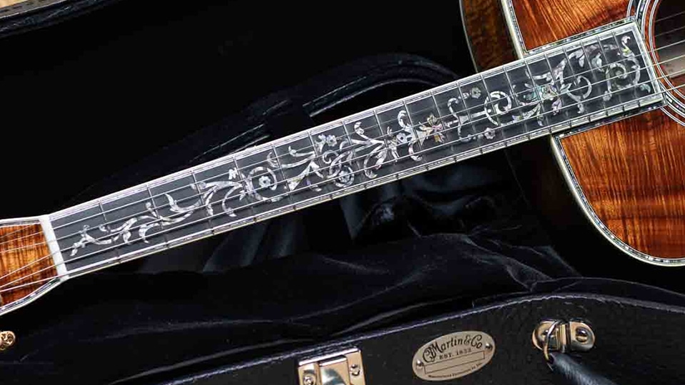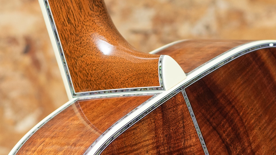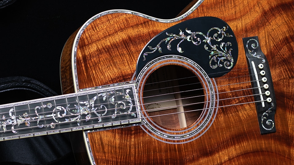 トリプルオーボディの45スタイルをベースに、ファクトリーにて選定したプレミアムグレードのハイリーフレイムドコア材をボディ全面に採用。指板、ピックガードにツリーオブライフインレイを施し、ブリッジにはアイランドスクロールインレイ、そしてギター全体の随所にアバロンの装飾を施した豪華デラックス仕様。ヘッドには象徴的な縦ロゴが光り、ウェバリー製エングレイブドボタンのゴールドペグが存在感を放ちます。ネックは43mm幅、各部の接着にはニカワを採用、 仕上げは Thin Finish。見た目の美しさだけでなく、演奏性、サウンド面も追求した極上の1本。