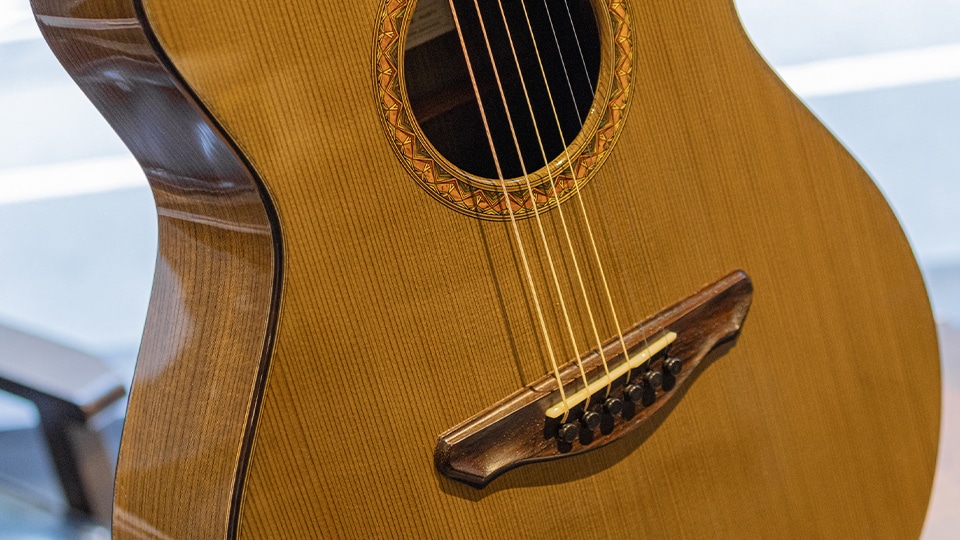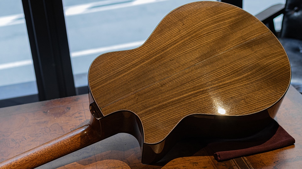 三木楽器200周年を記念してオーダーした記念モデル、藤井圭介作の神代木を使用した特別な"OM cw"。オガワインレイクラフト小川 貴之氏作の豪奢なカスタムインレイが華やかに色添えをする至極の逸品。