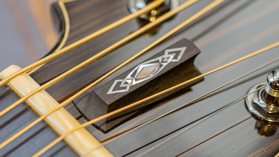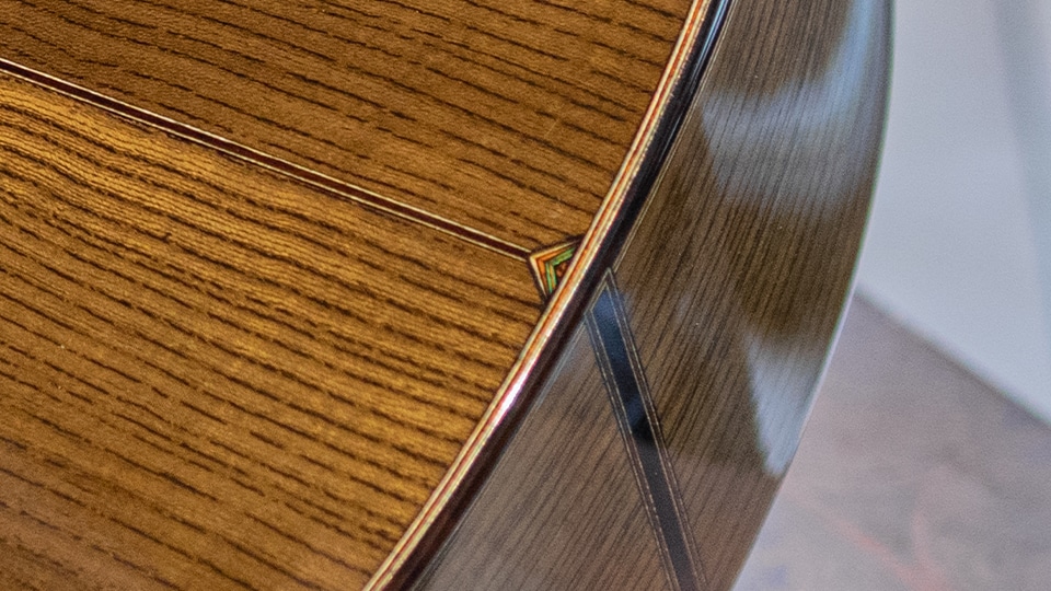 本器は神代木を使用した特別な”OM-cw"に、藤井さんの作る美しい寄木細工にインスパイアされた細い線が折り重なる豪奢なカスタムインレイワークが華やかに色添えをする1本。