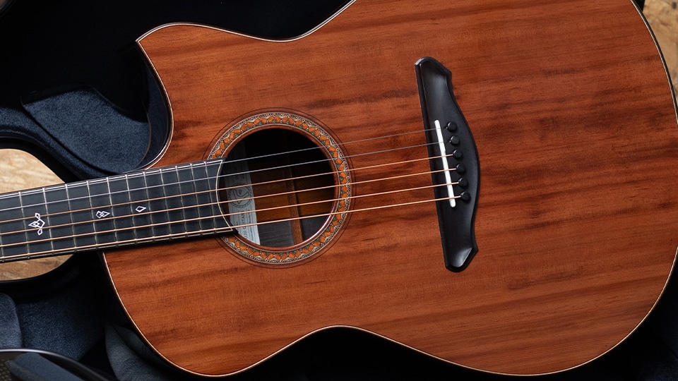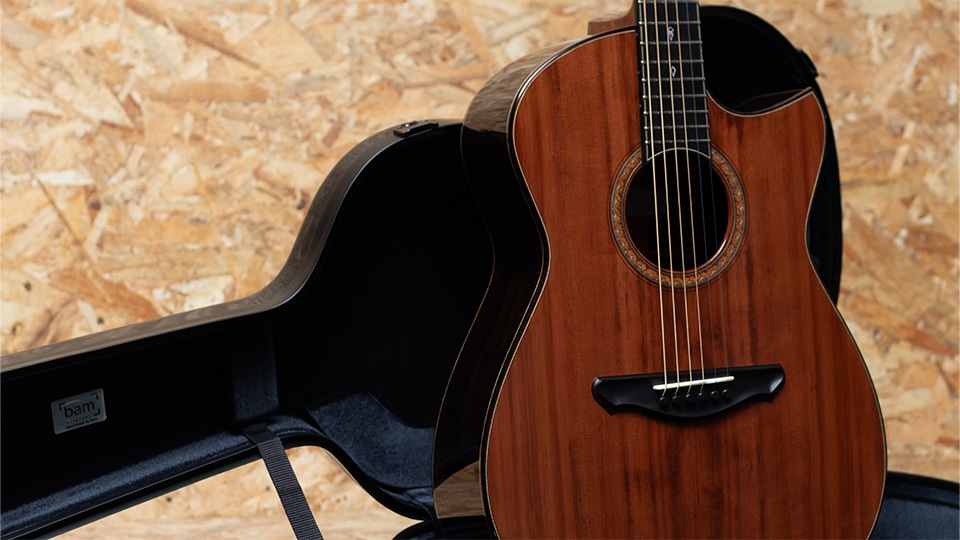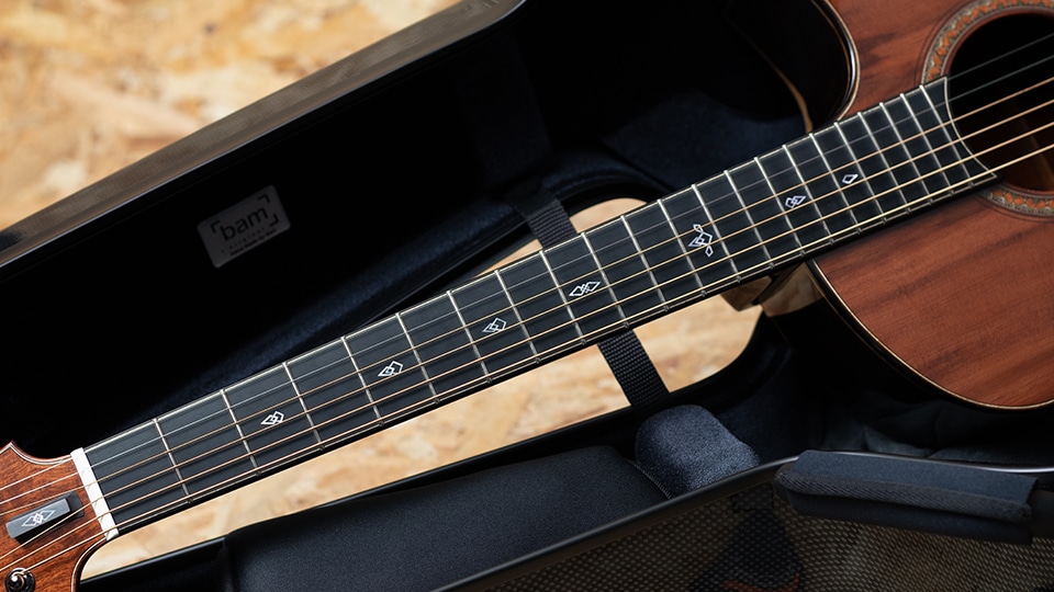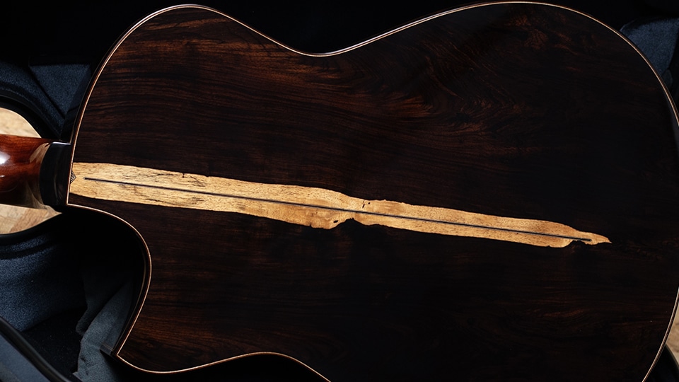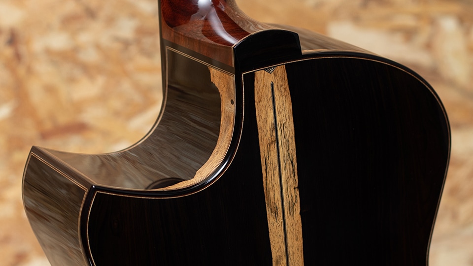 トップには南米産の希少材アレルセを採用。ヒノキ科に属しながら“チリ杉”とも呼ばれるこの材は、杉のような軽やかさとヒノキのような張りと緻密さを併せ持ち、澄み切った透明感と美しい倍音を湛え、優れたレスポンスと立体感のあるサウンドを奏でます。サイド&バックには高密度で硬質なアフリカンブラックウッドを用い、重厚な低音域と煌びやかな高音域を両立し、深みのある音響空間を描き出します。