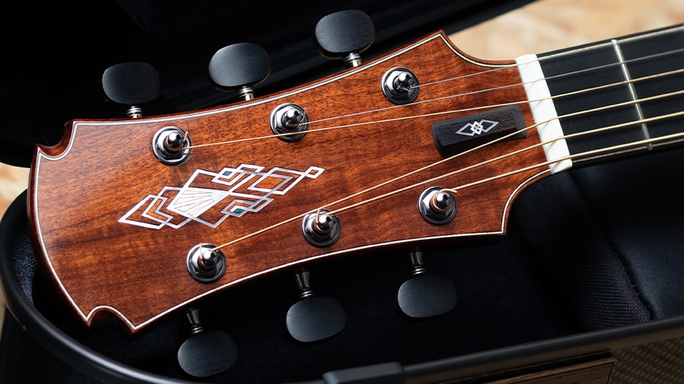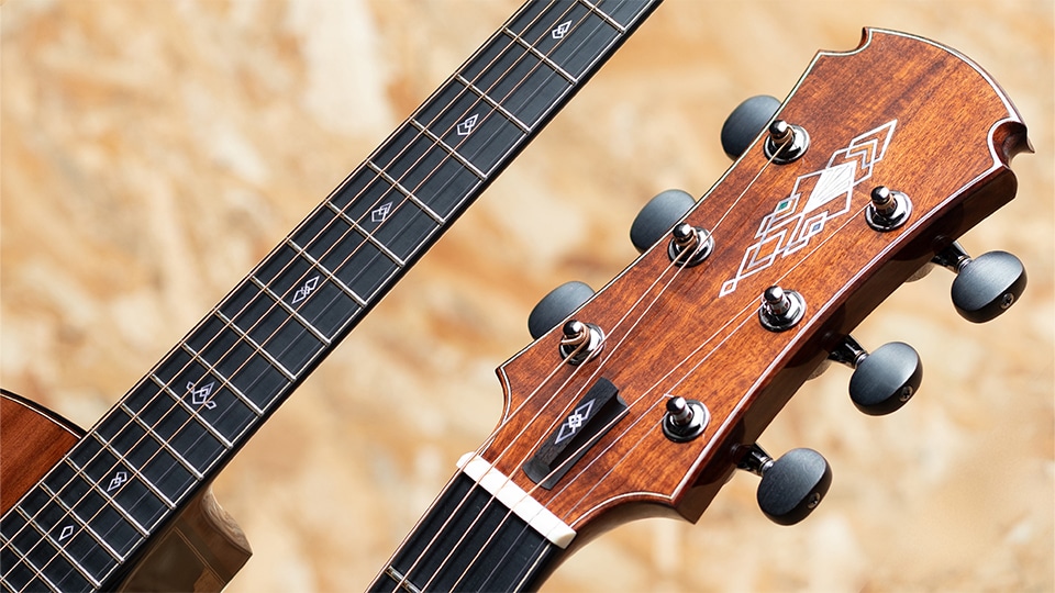 そしてOGAWA INLAY CRAFTによるインレイワーク。寄木細工のロゼッタからインスパイアされたカスタムデザインで、ヘッドインレイには白蝶貝とメイプル材、アンボイナ材、そしてグリーンのスタビライズドウッドを組み合わせ、華やかで個性的な意匠を表現。加えて指板およびロッドカバーのインレイも統一感あるデザインで仕上げられ、芸術性を帯びた装飾が楽器全体に特別な存在感を与えています。