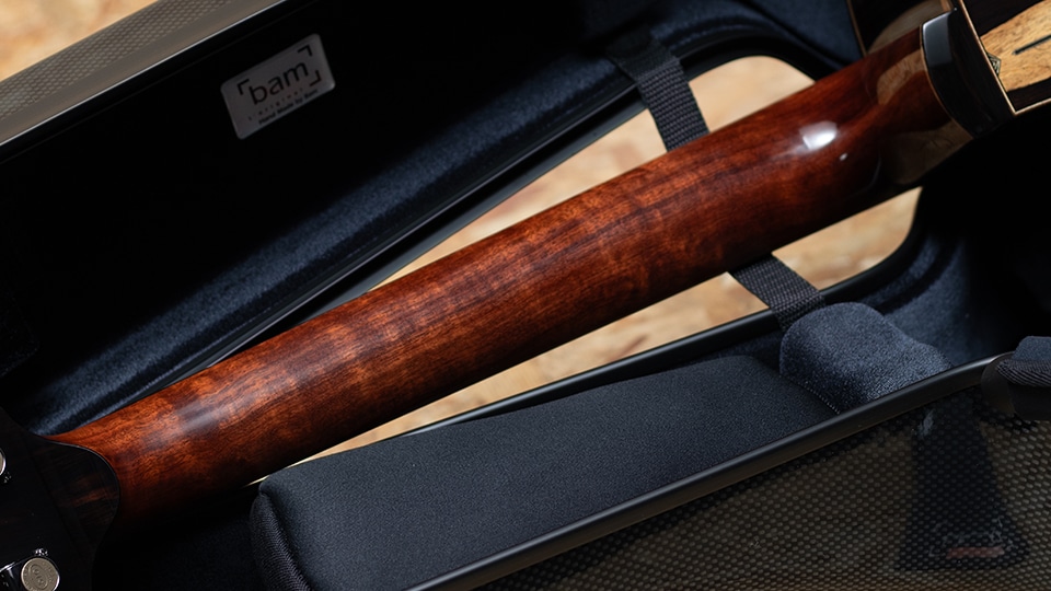 ネックには一般的なマホガニー系材ではなく、堅牢で音の輪郭を明瞭に引き立てるグラナディロを採用。仕上げにはフレンチポリッシュを施し、薄い塗膜が木材本来の響きを解放。経年変化とともに味わいを増す伝統的な塗装です。