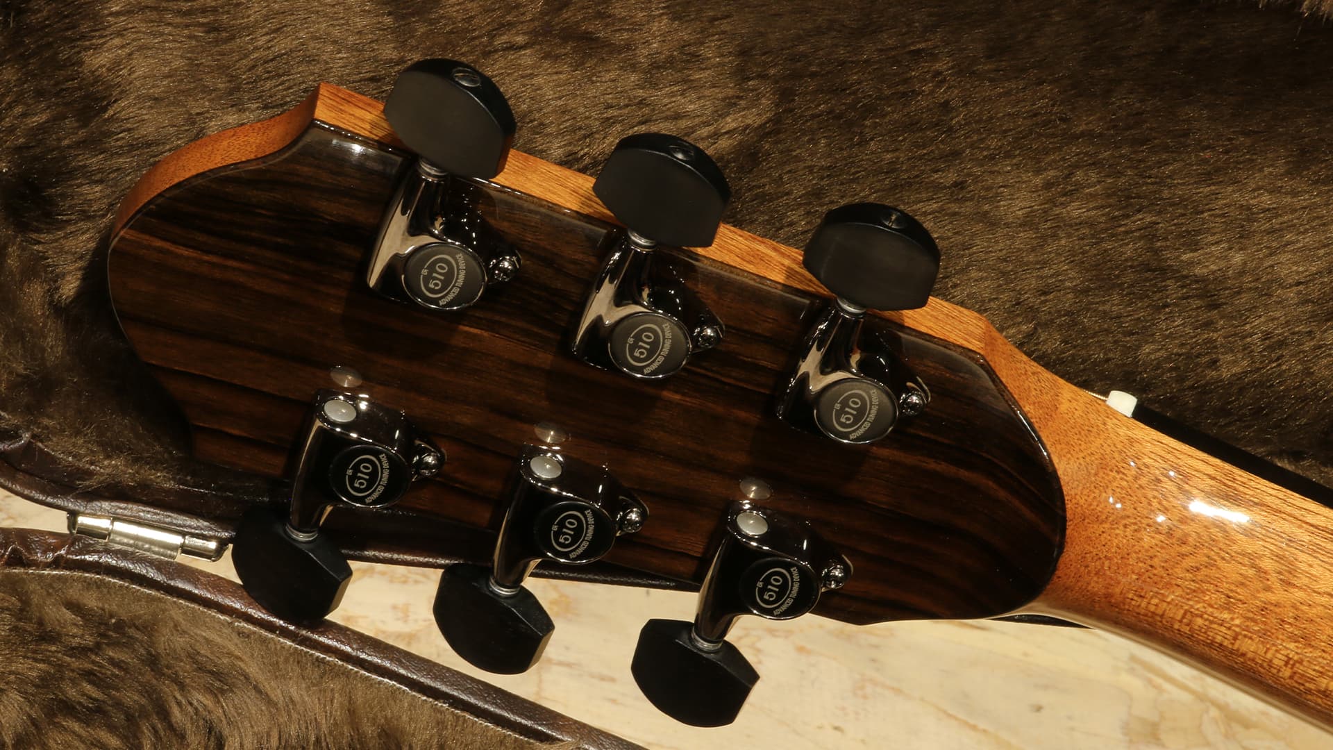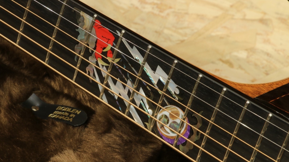 指板の8F-13Fにかけて施されたインレイワークのテーマは"鬼札"(Oni-Fuda)。大枠のデザインは古谷氏が行い、インレイワークは国内最上級のインレイ技術を持つ小川氏の最高センスによって具現化されました。古谷氏によるとアフリカンブラックウッドが持つ深い黒が雨のイメージを連想させる印象を受けていて、江戸時代から続く三木楽器とのインスピレーションも相まり、花札の雨札に登場する鬼札にインスパイアされるデザインに行き着いたとの事。花札の中でもジョーカー的な役割を果たす札がモチーフというポイントもミステリアスで惹かれるポイントです。ロゼッタに関しても鬼札にちなんで雷がモチーフとなったデザインになっています。
