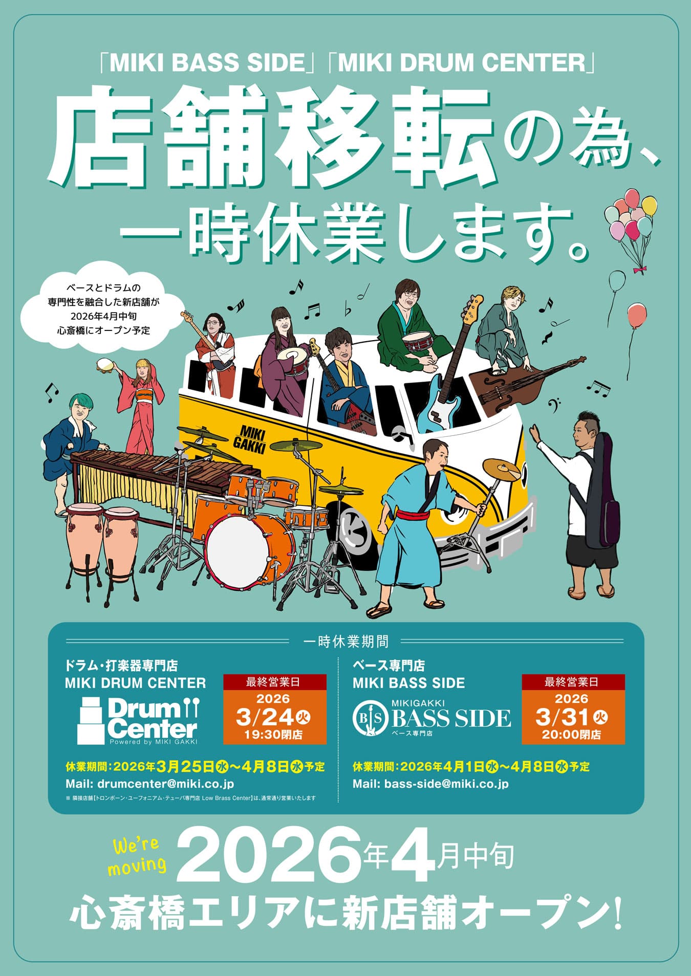この度「MIKI BASS SIDE」および「MIKI DRUM CENTER」を移転し、2026年4月中旬、心斎橋エリアに新店舗をオープンいたします。