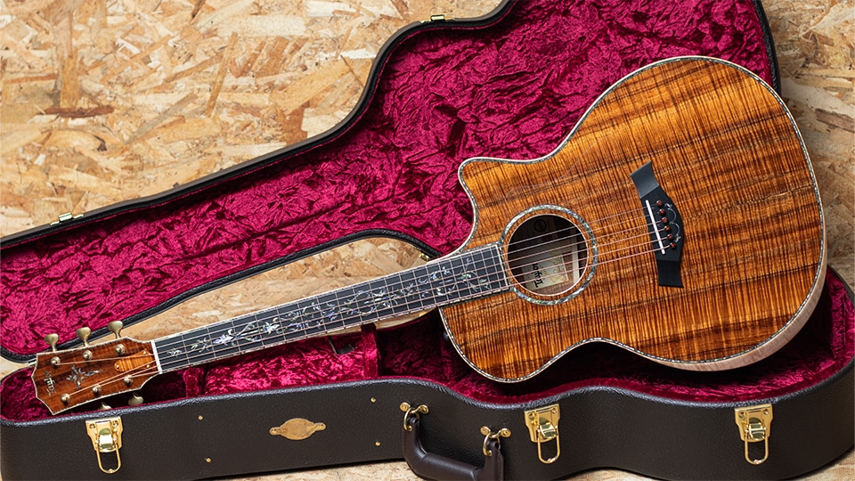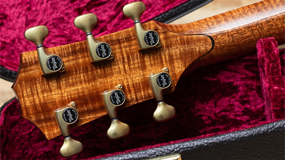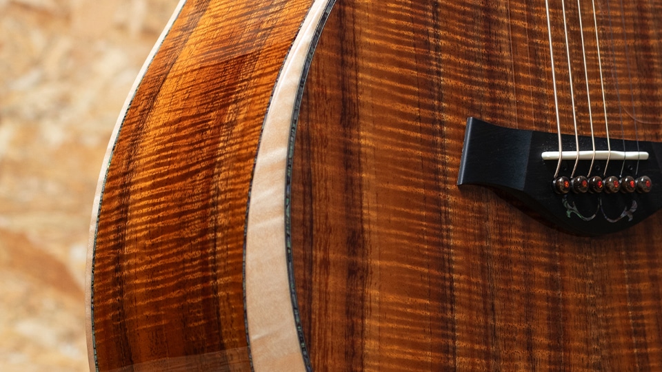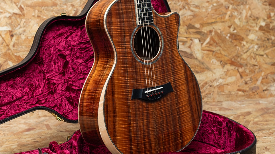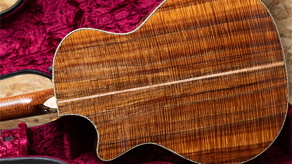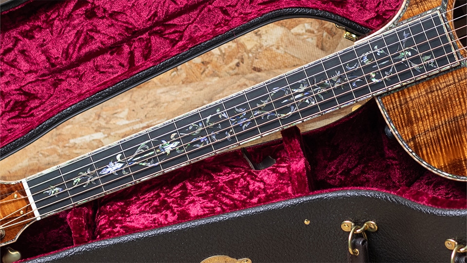 本器は三木楽器創業200周年を記念して弊社スタッフがテイラー社現地にて、CEO兼、マスタールシアーであるアンディ・パワーズとともに材選定を行ったカスタムオーダー品”Grand Auditorium Custom”。グランドオーディトリアムボディ、マスターグレードハワイアンコアボディ、フィギャードマホガニーネック、エボニー指板&ブリッジ、ベベルコンター、ハワイアンコアヘッド突板、フィギャードメイプルバインディング、ゴトー510ゴールドペグ、ES2ピックアップ搭載。